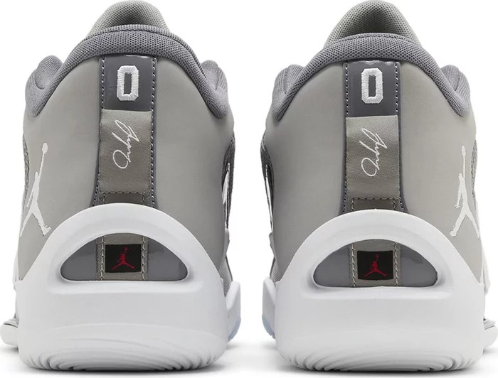 Кроссовки Jordan Tatum 1 Cool Grey вдохновлены цветом любимых Джорданов Тэйтума, Cool Grey 11. Верхняя часть, изготовленная из дышащей серой сетки, укреплена тональными синтетическими накладками по всему периметру глазков и пятки. Последняя украшена крупным брендингом Jumpman на боковой стороне, а личный логотип Тэйтума украшает язычок. Заметный каркас из TPU поддерживает промежуточную подошву Phylon, в передней части которой расположен блок Zoom Air. Легкая подошва усилена резиной в носочной части и на носке для надежного сцепления.- Цвета: Medium Grey/White/Gunsmoke
