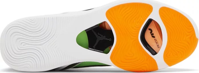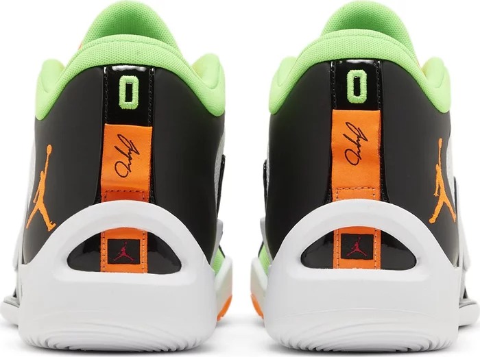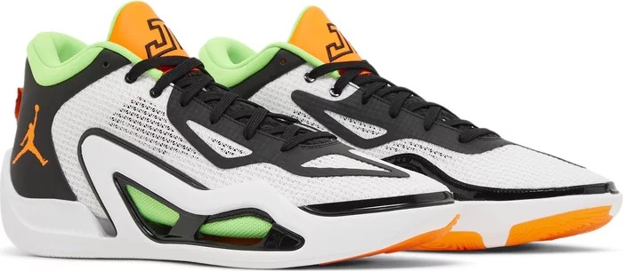 Jordan Tatum 1 'Home Team' - это дебютные фирменные кроссовки Джейсона Тэйтума с воздухопроницаемым белым сетчатым верхом, подкладкой из неоново-зеленого текстиля и накладкой на пятку из черной искусственной кожи. Последняя украшена вышивкой Jumpman в оранжевом цвете на боковой стороне, а также язычком и вставкой из тесьмы. Изящный силуэт опирается на легкую подошву Phylon с амортизацией Zoom Air и опорным элементом TPU для боковой устойчивости. Подошва ограничивает сцепление резины с поверхностью в передней части стопы для снижения веса.- Цвета: White/Total Orange/Black/Green Strike