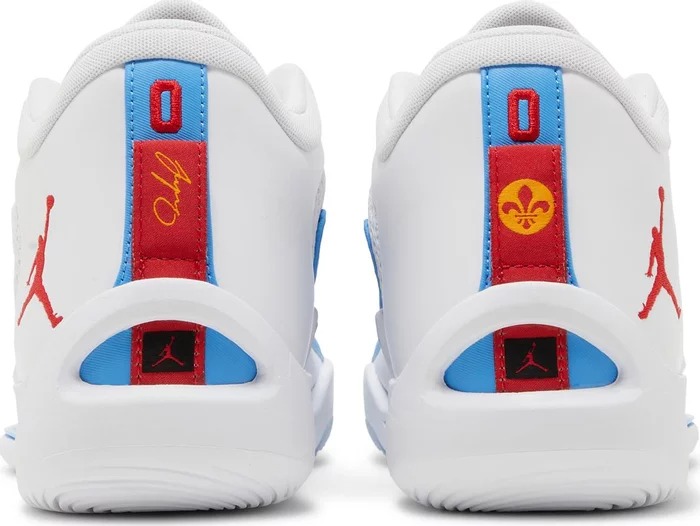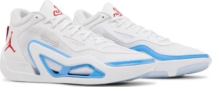 Air Jordan Tatum 1 St. Louis - дебютная фирменная модель Джейсона Тэйтума. Легкий силуэт имеет вентилируемый верх из белой сетки, укрепленный каркасом из TPU и украшенный красно-голубым принтом вдоль пятки. В носочной части расположены большие подушечки Zoom Air, а также подошва из вспененного материала с минимальным резиновым усилением под носком и сводом стопы.- Цвета: White/University Red/University Blue/University Gold