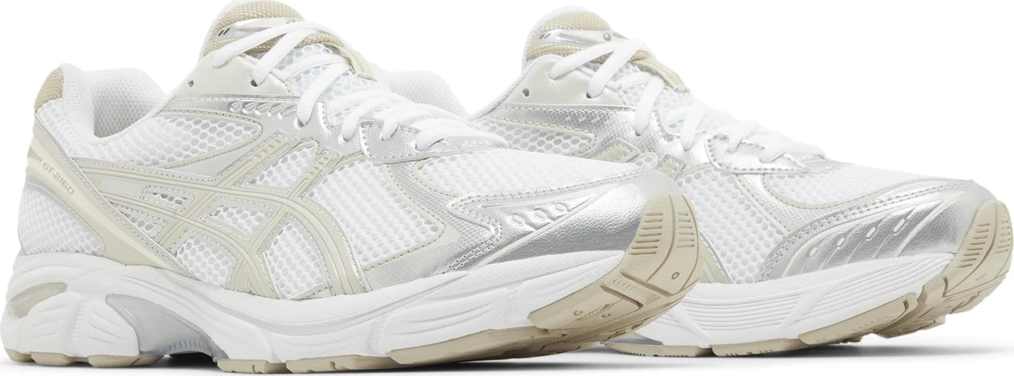 Модель Asics GT 2160 White Putty повторяет технический язык дизайна долгоиграющей серии GT-2000 начала 2010-х годов. В этой модели используется дышащий белый сетчатый верх с накладками из искусственной кожи серебристого цвета. Легкая промежуточная подошва из ЭВА дополнена вставкой GEL серебристого цвета в пятке для защиты от ударов и плавного хода. Под подошвой из резины видна система поддержки ASICS TRUSSTIC - пластина из TPU для устойчивости в средней части стопы.- Цвета: White/Putty