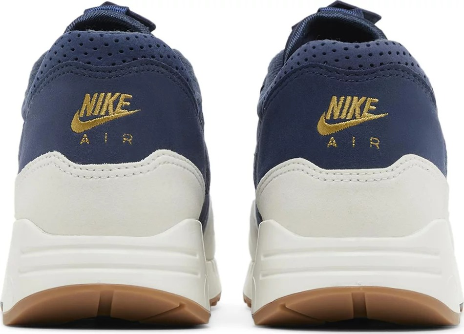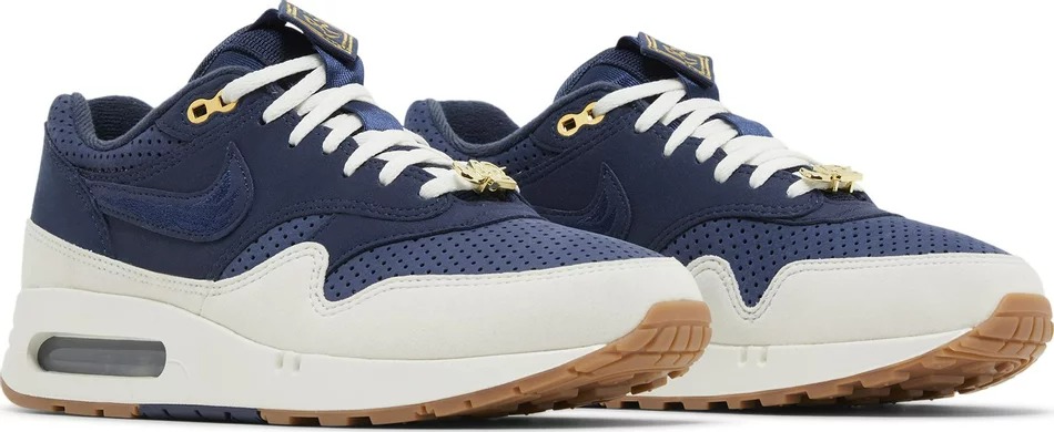 Кроссовки Nike Air Max 1 '86 OG Big Bubble - Jackie Robinson посвящена легендарному бейсболисту, вышедшему в 1947 году на поле в составе команды Brooklyn Dodgers. Верх ретро-кроссовок выполнен из перфорированного нубука темно-синего цвета, на пятке вышит золотой брендинг Nike Air. Номер Робинсона указан на ромбовидном язычке и золотых металлических украшениях на шнурках.