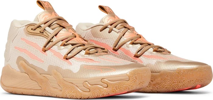 Расцветка PUMA MB.03 Chinese New Year обновляет третью фирменную обувь ЛаМело Болла, создавая праздничный дизайн в честь года Дракона. Верхняя часть мид-топа выполнена из сетчатой ткани цвета загара и украшена следами от когтей кораллового цвета по всей верхней части и боковым панелям. Тускло-золотистые акценты расставлены на накладке передней части стопы и язычке, украшенном логотипом крыльев ЛаМело. Золотые блестки украшают резиновую подошву, которая огибает боковые стенки промежуточной подошвы NITROFOAM цвета хаки.- Цвета: Gold/Fluro Peach