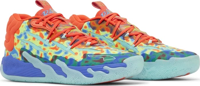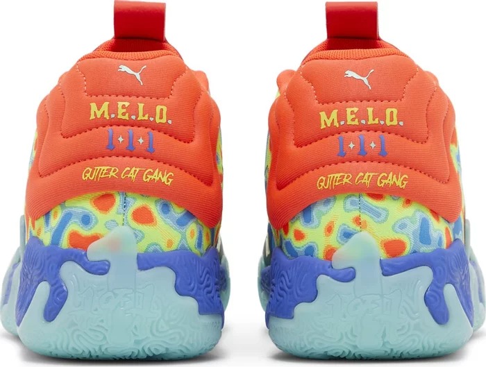 Кроссовки PUMA MB.03 GutterMelo - третья фирменная обувь ЛаМело Болла, выпущенная ограниченным тиражом и созданная в сотрудничестве с Gutter Cat Gang, самоназванным "подпольным социальным клубом web3". Верхняя часть кроссовок сочетает в себе сетку ярко-зеленого цвета с разноцветными синтетическими накладками синего, зеленого и алого цветов. Последний оттенок повторяется на воротнике, шнурках и язычке, где изображена графика Gutter Cat с брендингом ЛаМело "Rare". Кроссовки поддерживаются мидсолью из вспененного материала NITRO Infused, а подошва из нескользящей резины с высокой степенью износа завершает дизайн.- Цвета: Red Blast/Safety Yellow