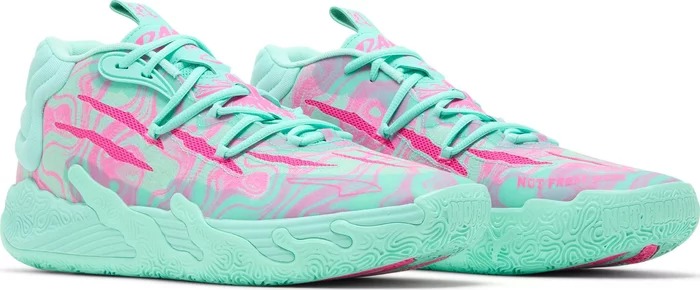 Третья фирменная модель ЛаМело Болла Puma MB.03 Miami выполнена в ярких цветах, отдающих дань уважения Майами. Верх из прочной синтетики выполнен в ярко-розовом цвете с зелеными акцентами. Вырезанные когти открывают дышащую сетчатую подкладку розового цвета, которая сочетается с подкладкой воротника и подошвой из износостойкой резины. В качестве амортизатора используется полноразмерная промежуточная подошва NITROFOAM.- Цвета: Teal/Purple