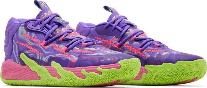 Вдохновленные инопланетным подземным миром, кроссовки PUMA MB.03 "Toxic" представляют собой третью фирменную обувь ЛаМело Болла, выполненную в буйном сочетании фиолетового и тилового оттенков, а также следов когтей на розовой сетчатой подложке. Шнурки проходят через люверсы для фиксации стопы, а мягкий воротник обеспечивает удобную посадку. Легкая амортизация обеспечивается промежуточной подошвой NITROFOAM от PUMA, выполненной в сияющем розовом цвете и завернутой в флуоресцентно-зеленую резиновую подошву.- Цвета: Purple Glimmer/Green Gecko