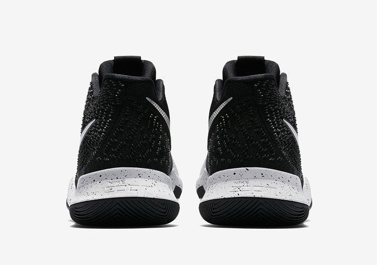 Модель Kyrie 3 имеет черный сетчатый верх с белыми акцентами на ремешке в передней части стопы и кожаным логотипом Swoosh по бокам. Кроссовки также имеют мягкий язычок для дополнительного комфорта, амортизирующую подошву в крапинку и независимые сцепные подушечки Volt и оранжевого цвета на подошве в передней части стопы.