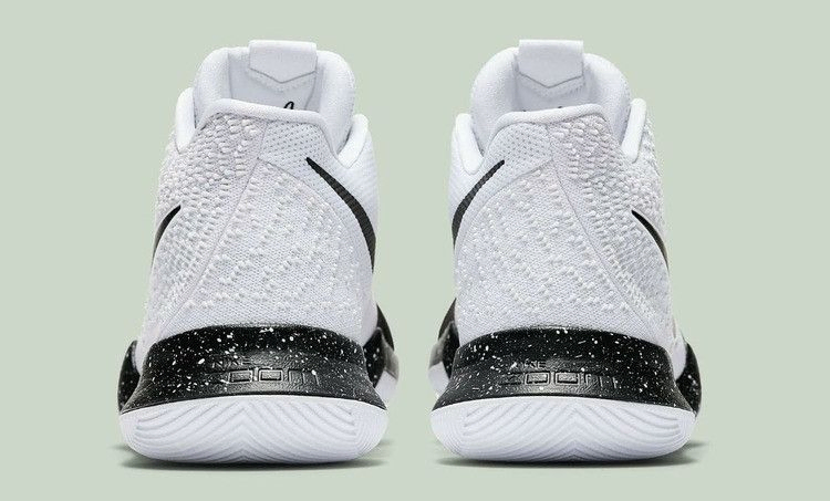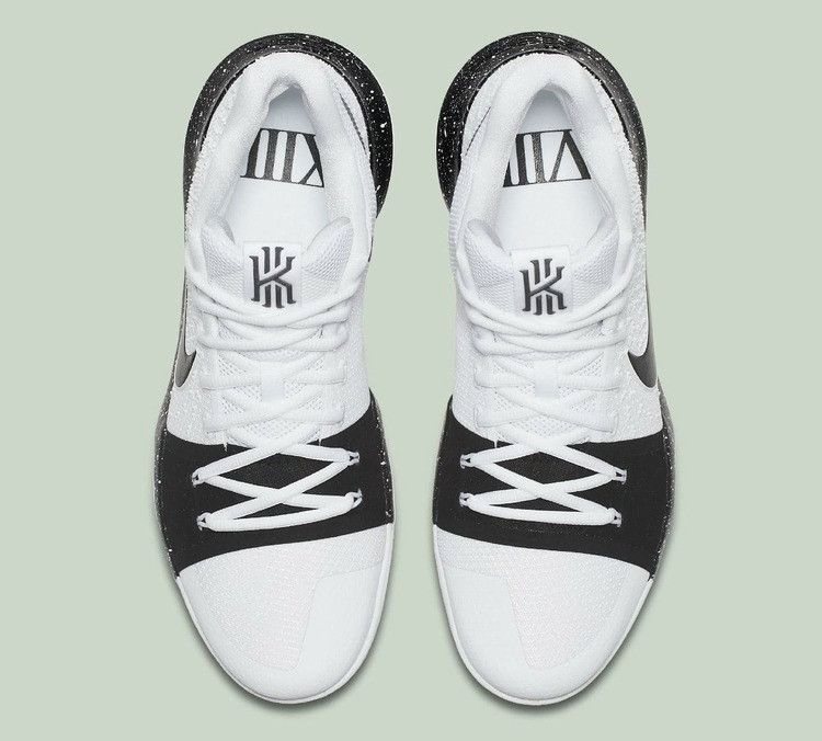 Nike приправляет черно-белую палитру Kyrie 3 акцентами Volt на подошве. Контрастная межподошва в крапинку контрастирует с белым верхом, который также подчеркнут черной полосой на передней части стопы. В кроссовках также сохранилась изогнутая подошва, которая впервые появилась на Kyrie 2.