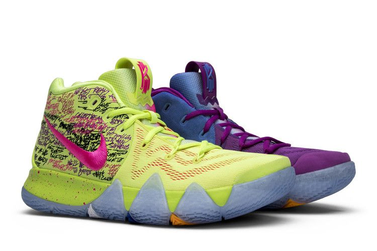 Kyrie 4 "Confetti" выполнены в стиле микс-энд-матч, состоящем из ярких оттенков в несочетаемом виде. Другие детали дизайна включают серию контрастных надписей на четверть-панели и разноцветную графику ромба на подошве.