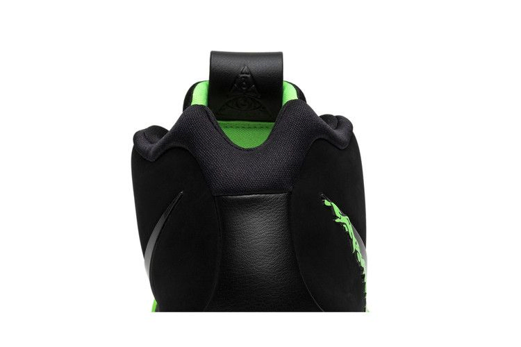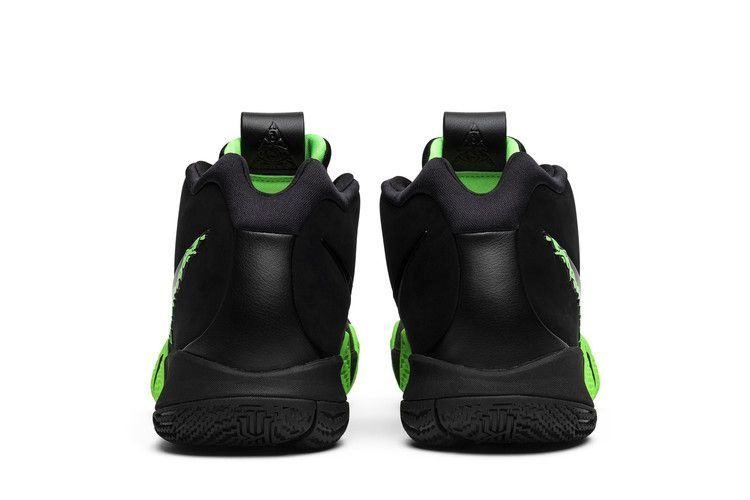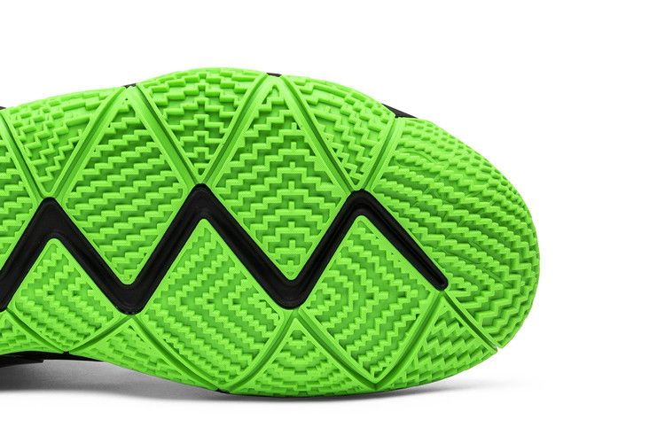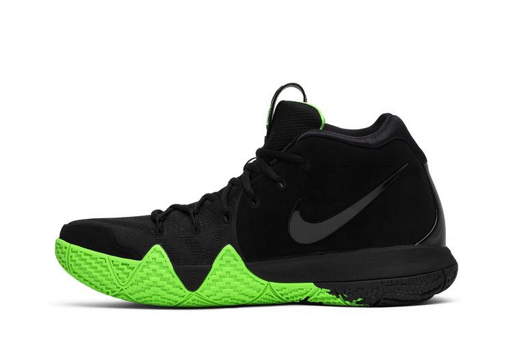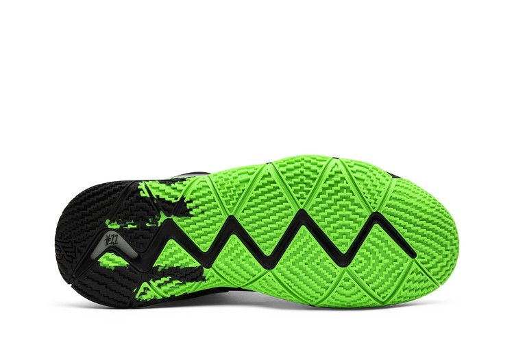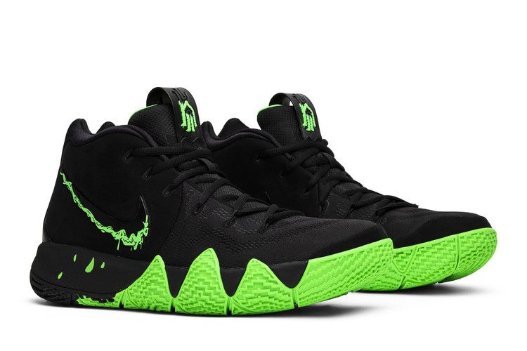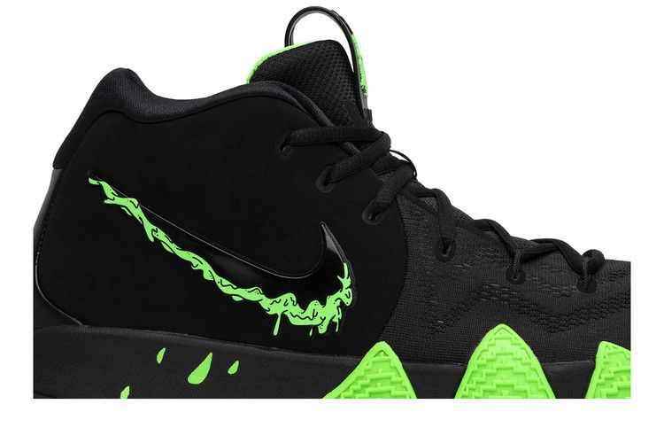 Nike Kyrie 4 нарядились к Хэллоуину, получив полностью черную отделку верха из комбинированной сетки и нубука. На нижней стороне черного глянцевого логотипа Swoosh изображена зеленая слизь, которая капает на черную промежуточную подошву. Черный кожаный язычок и характерная резиновая подошва Kyrie 3 с изгибом вверх также выполнены в зеленом цвете.