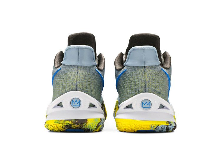 Модель Kyrie Low 4 EP 'Light Armory Blue' имеет полупрозрачный текстильный верх с вышитым брендингом Swoosh и вставкой на пятке из искусственной кожи. В шнурки интегрированы TPU-ребра, обеспечивающие плотную посадку, а низкий воротник с мягкой подкладкой обеспечивает свободу движений. Кроссовки опираются на полноразмерную межподошву из пеноматериала Cushlon, дополненную амортизацией Zoom Air в передней части стопы. Многоцветная отделка нанесена на подошву, изготовленную с помощью компьютера, из сверхпрочной резины, предназначенной для использования на открытых площадках.
