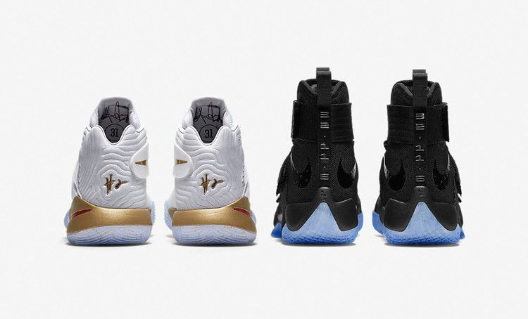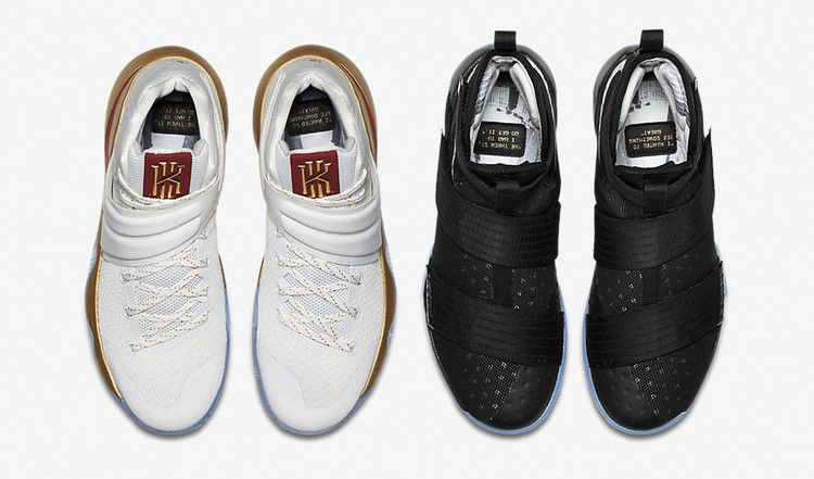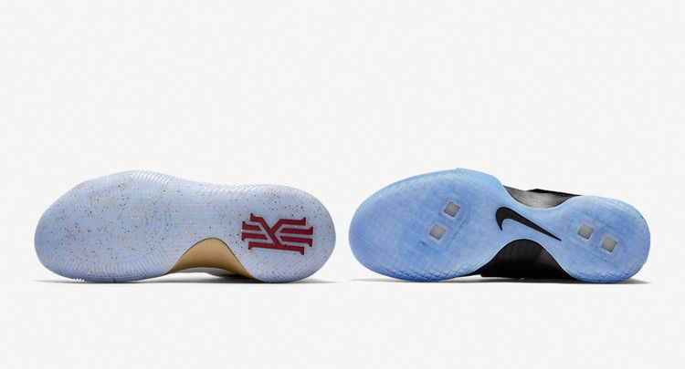 Силуэт Kyrie имеет преимущественно белый сетчатый верх, акцентированный бордовыми и золотыми тонами на средней подошве и язычке, а также ледяную голубую подошву для контраста. Ботинки LeBron имеют преимущественно черный сетчатый верх, застежку-липучку на трех ремешках и внутренний ботинок с полупрозрачной голубой подошвой.