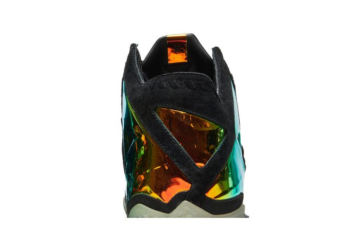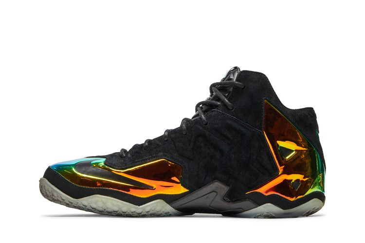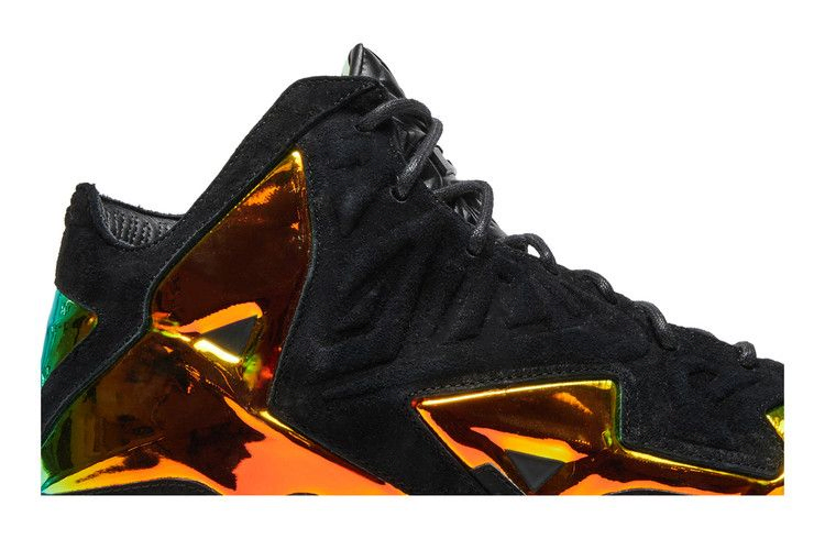 Модель Nike Lebron 11 EXT "King's Crown" вышла в 2014 году в насыщенном золотисто-черном цветовом решении. Верхняя часть из черного нубука с кожаным язычком и шнурками выполнена из материала Hyperposite с переливающейся золотой отделкой. Тисненая корона и золотой гребень на язычке дополняют королевскую тему.