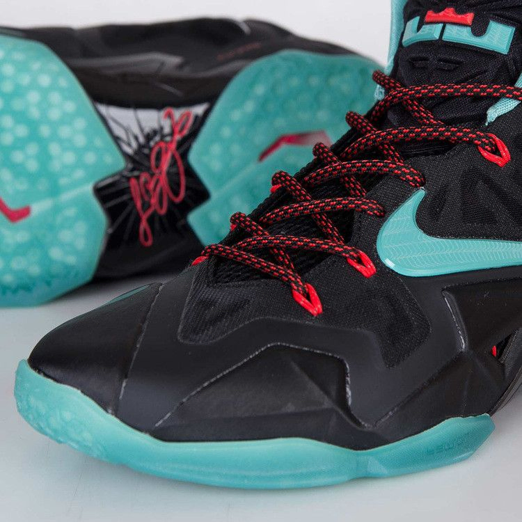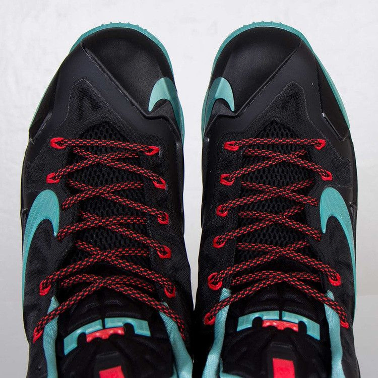 Nike LeBron 11 "Jade" - это черная верхняя часть из материала Hyperfuse и Hyperposite, дополненная свушем, подкладкой и подошвой цвета Diffused Jade. Малиновый цвет присутствует на люверсах, шнурках и язычке. Кроссовки с высоким верхом также оснащены стелькой Lunarlon и полноразмерной системой Zoom Air, а также черным голенищем с подписью Леброна.