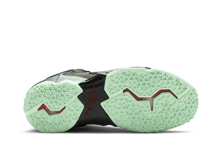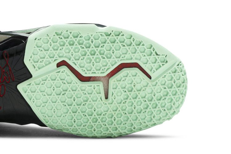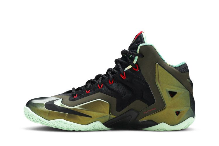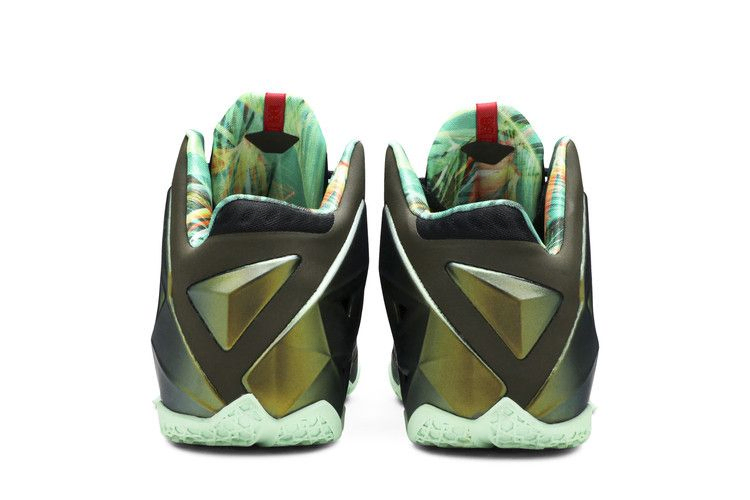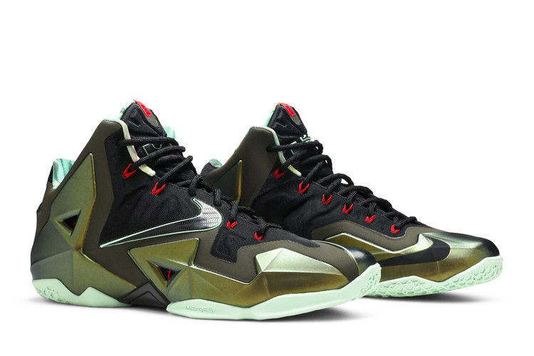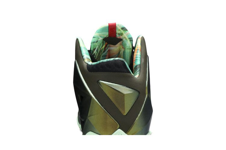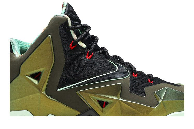 В элегантном дизайне, объединяющем технологии Hyperposite, Flywire и Hyperfuse, модель Nike LeBron XI "King's Pride" обеспечивает ловкость и поддержку, а также динамичную посадку. Черные язычок и носок контрастируют с бронеподобными накладками зеленого металлического оттенка, а на носке - цветочный принт и промежуточная подошва Lunarlon.