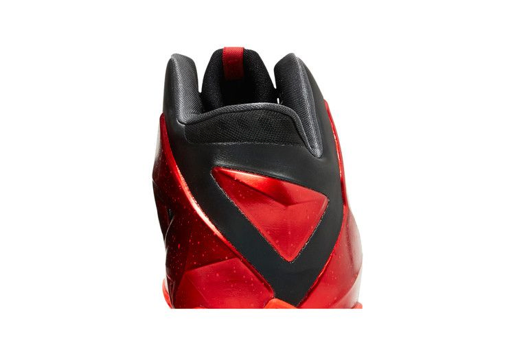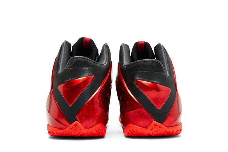 Модель LeBron 11 выполнена в традиционных дорожных цветах Miami Heat и имеет бронированную конструкцию из смеси легких панелей Hyperposite и сетки Hyperfuse. Черная и красная расцветка сегментирована на этих панелях, хотя красная расцветка также присутствует на тросах Flywire. Амортизация Nike Zoom и Lunarlon впервые встретились в одной из фирменных моделей Леброна.
