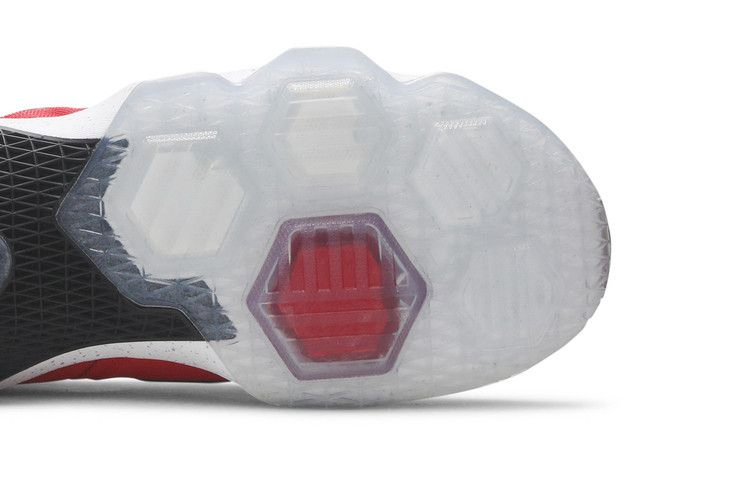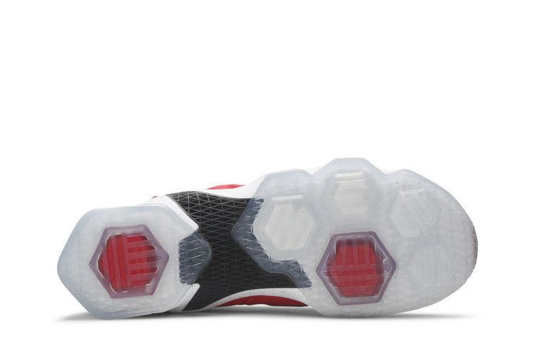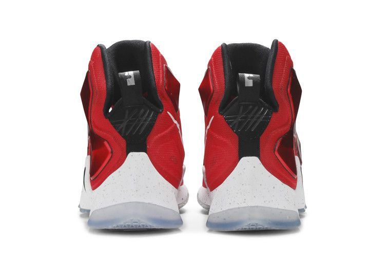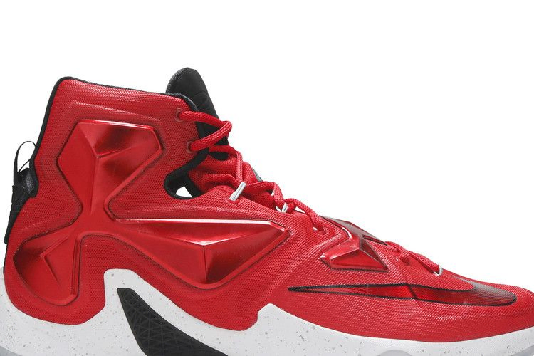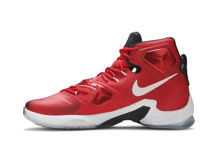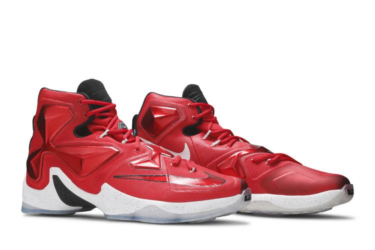 Модель LeBron 13, разработанная Джейсоном Петри в 2015 году, была интересна своей конструкцией из смешанных материалов. LeBron 13 "On Court" имеет верх из дышащей сетки с технологией Flywire по бокам для поддержки, детали Hyperposite на средней части стопы и воротнике, а также асимметричную систему шнуровки для адаптивной посадки. Кроссовки одеты в красный цвет и украшены черными акцентами, а также имеют пятнистую подошву и амортизацию Zoom Air для легкого комфорта.