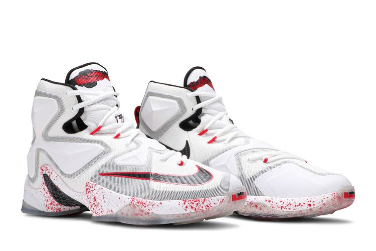 LeBron 13 представлены в жутковатой тематике, вдохновленной фильмом "Пятница 13-е". Верхняя часть из белой и серой сетки контрастирует с графикой брызг крови на межподошве и брендингом LeBron. Надпись "13" на язычке - кивок в сторону 13-й модели LeBron и фильма ужасов, а тросы Flywire на заднике усиливают поддержку передней части стопы. Амортизирующие элементы Nike Zoom Air на подошве служат для амортизации.