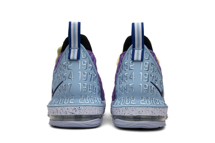 Кроссовки Nike LeBron 16 "Lakers Heritage", представленные в мае 2019 года, рассказывают о богатой чемпионской истории Лос-Анджелеса. Годы побед франшизы подробно описаны на кожаном обтекателе пятки кроссовок из материала BattleKnit 2.0, а на язычке красуется логотип Джеймса в виде синельной короны и номер джерси. На стойке красуются украшенные и пришитые к ней Swooshes. Промежуточная подошва в крапинку и резиновые сцепные подушечки разделены по всей длине видимой амортизацией Zoom Air.