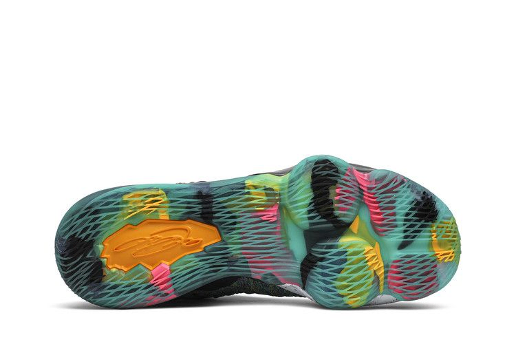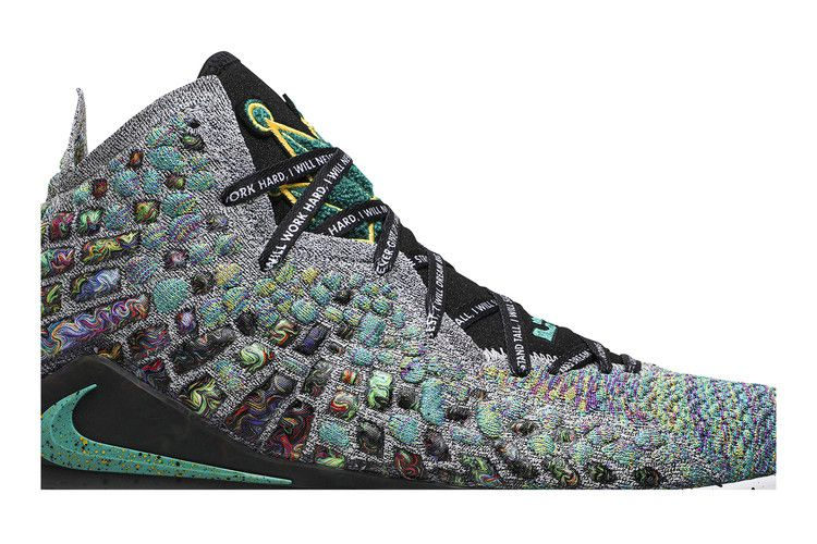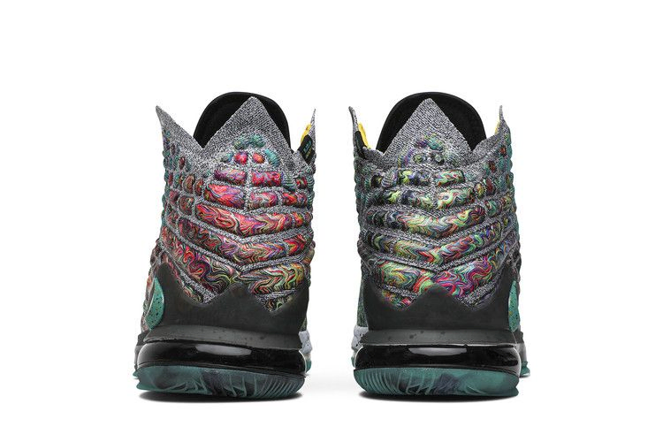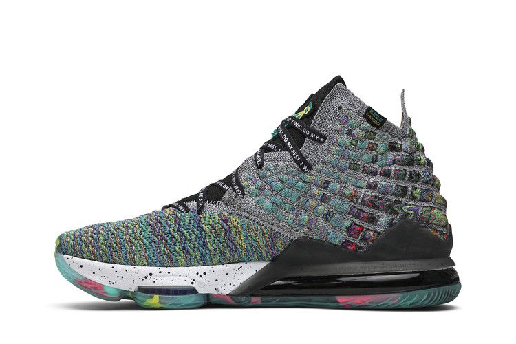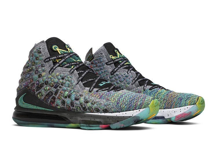 Модель LeBron 17 "I Promise" вдохновлена одноименной школой, основанной в 2018 году Леброном Джеймсом в его родном городе Акрон, штат Огайо. Серый трикотажный верх кроссовок украшен разноцветным калейдоскопическим рисунком, такой же яркий микс нанесен на резиновую подошву под ногами. Дополнительные детали включают в себя вдохновляющие фразы, напечатанные на шнурках, и корону Семейного фонда ЛеБрона Джеймса, вышитую на язычке.