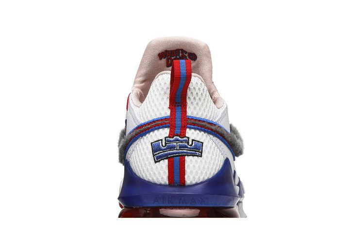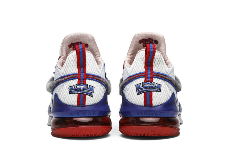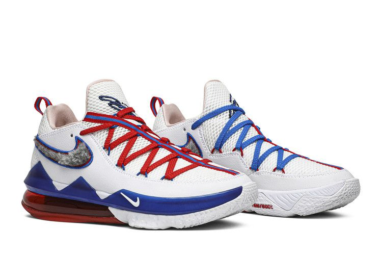 LeBron 17 Low Pre-Heat "Tune Squad", выпущенные во время Всезвездного уик-энда в составе двух частей, вдохновленных сиквелом ЛеБрона Джеймса "Космический джэм", - это модель, посвященная противникам Монстарз. Низкая модель имеет белый трикотажный верх, украшенный искусственной кроличьей шерстью Swoosh и несовпадающими шнурками синего и красного цветов. На внутренней стороне язычка вышита фраза Багза Банни "What's up doc?", а брендинг Tune Squad украшает носок.