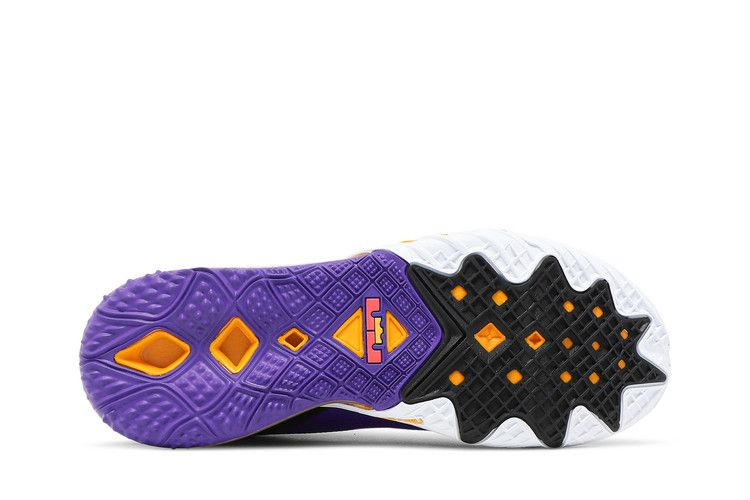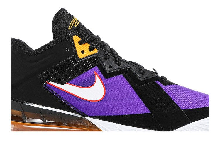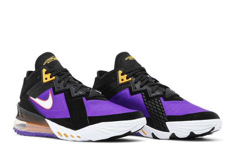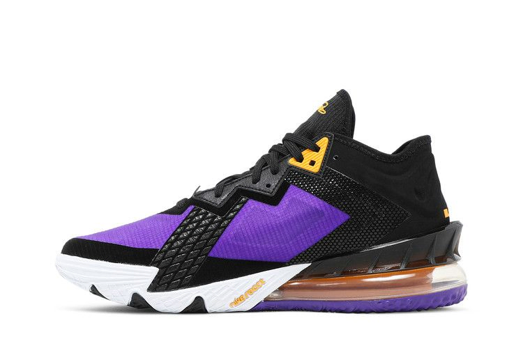 Модель Nike LeBron 18 Low 'ACG Terra' выполнена в знакомой цветовой гамме, которая отдает дань уважения классическому силуэту из архива бренда. Низкие кроссовки имеют текстильный верх фиолетового цвета с контрастными черными накладками и желтыми литыми люверсами. Последний оттенок повторяется на брендинге LeBron James на пяточной панели и язычке. Внешний фиксатор пятки расположен над объемным блоком Max Air, который в паре с полноразмерной промежуточной подошвой Nike React обеспечивает отзывчивость на корте.