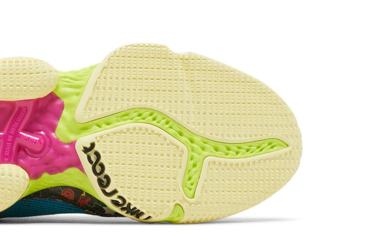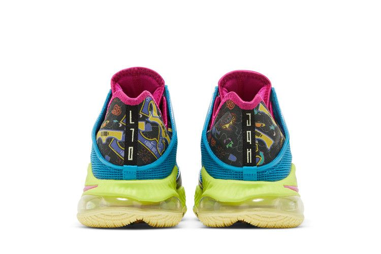 Nike LeBron 19 Low "LeBronival" отличаются яркой цветовой гаммой, которая подчеркивает праздничную тематику кроссовок. В фирменных низких кроссовках LeBron James используется дышащая сетчатая накладка яркого акватического оттенка, контрастирующая с многоцветным принтом в стиле карнавала на язычке, воротнике и носке. Легкая амортизация обеспечивается межподошвой из пеноматериала React цвета Citron Tint, а на боковой стенке красуется Swoosh цвета фуксии и крупногабаритный блок Max Air, расположенный под пяткой.