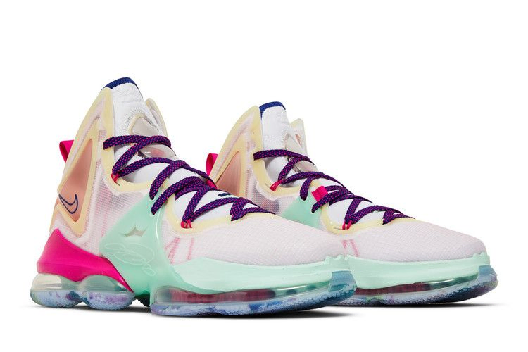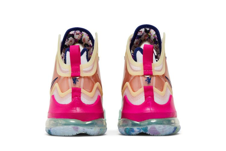 Nike LeBron 19 "Valentine's Day" придает фирменным кроссовкам Леброна Джеймса яркие оттенки. Полупрозрачный плетеный верх с тросами Flywire цвета фуксии и мятно-зелеными крыльями из TPU, встроенными в шнурки, имеет нежно-розовый оттенок. Пенопластовые подушечки на воротнике обеспечивают улучшенную поддержку голеностопа, а пурпурного цвета пяточная стойка - устойчивость задней части стопы. Кроссовки оснащены гибридной конструкцией, которая сочетает в себе 360-градусную подушку Max Air в пятке и отзывчивую амортизацию Zoom Air в передней части стопы.
