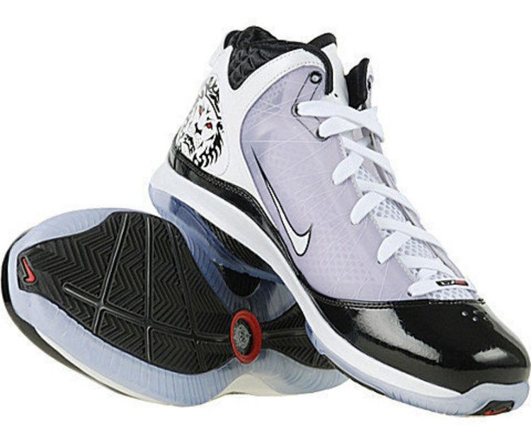 Постсезонная модель LeBron 7 имеет классическую командную расцветку с использованием бело-черной палитры на верхней части из кожи и сетки, а тросы Flywire обеспечивают надежную поддержку. Четверть щитков усилена полупрозрачной накладкой, совпадающей по цвету с ледяной подошвой, а система амортизации Zoom Air обеспечивает более четкий отклик для быстрых переходов на площадке.