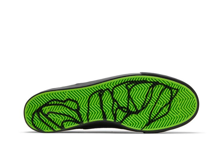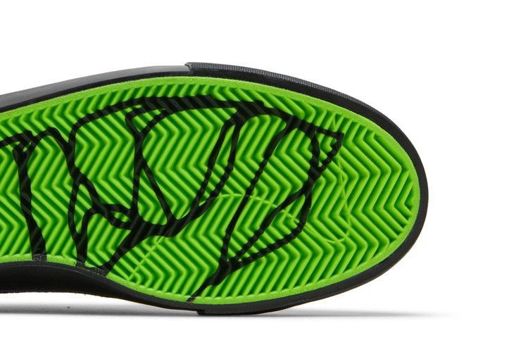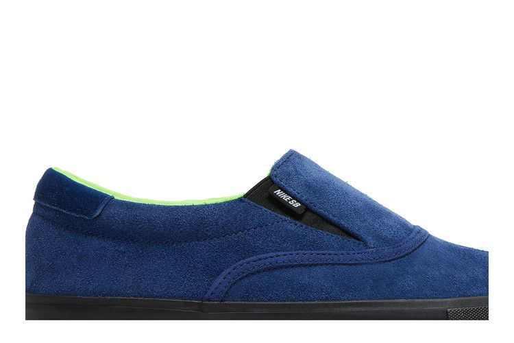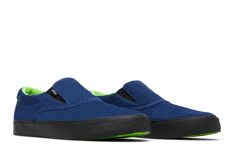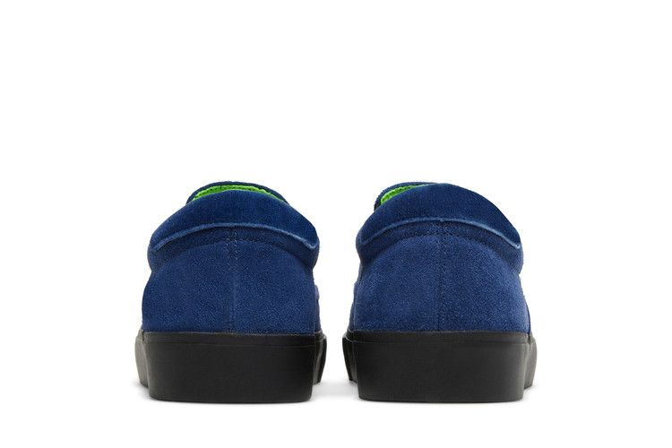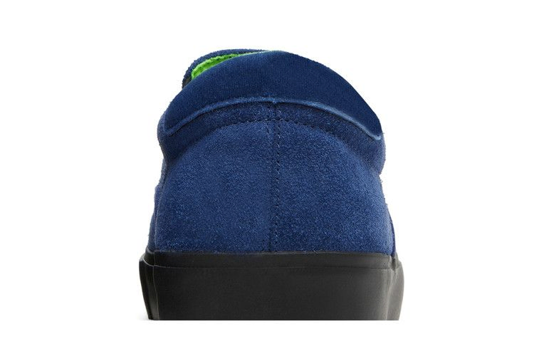 Модель Leo Baker x Nike Zoom Verona Slip SB 'Blue Void', разработанная в сотрудничестве с профессиональным райдером, представляет собой однотонные слипоны с оригинальным рисунком. Крылья бабочки, нарисованные Стивеном Островски, напечатаны на резиновой подошве, выполненной в электрическом зеленом цвете и имеющей сцепной рисунок "елочка". Верхняя часть без шнурков из замши темно-синего цвета с тональным бархатным язычком на пятке и эластичной резинкой для удобства надевания и снимания. Внешний брендинг ограничен незаметной вкладкой Nike SB на боковом язычке.