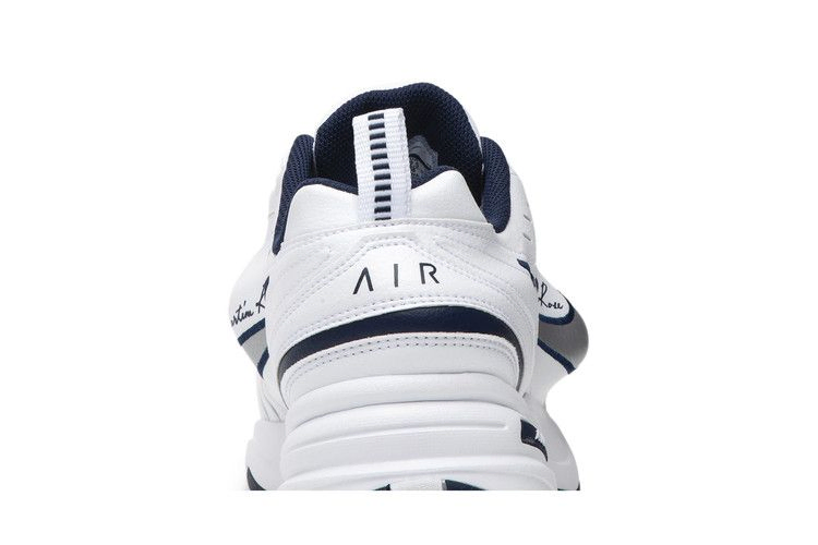 Модель Martine Rose x Air Monarch IV 'White Navy' сохранила оригинальный дизайн кроссовок, но лондонский дизайнер изменила общую форму кроссовок благодаря вставкам из полиуретана под белым кожаным верхом. Намереваясь нарушить привычные представления о кроссовках, Роуз начала свой творческий процесс с подгонки верха 18-го размера под 9-й размер, используя промежуточную подошву с полноразмерной амортизацией Nike Air.