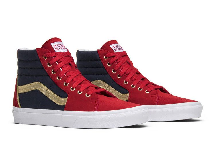 Эта модель SK8-Hi, выполненная в оттенках красного, темно-синего и золотого цветов, посвящена Капитану Марвелу. Верх кроссовка выполнен из прочного холста и замши, а подошва белая и вафельная. На пятке красуется логотип Капитана Марвел, а ее фирменный костюм дополняют золотистые металлические люверсы. Marvel x SK8-Hi 'Captain Marvel' - часть июньской коллаборации 2018 года между Vans и Marvel.
