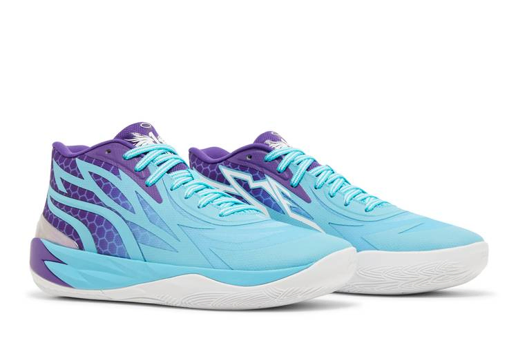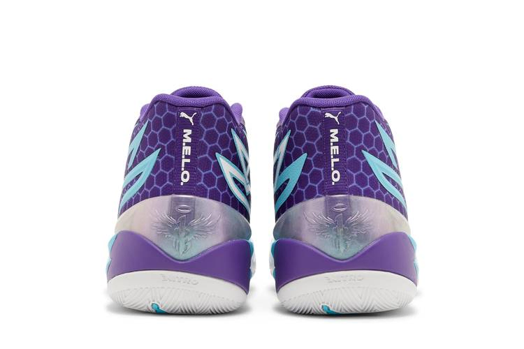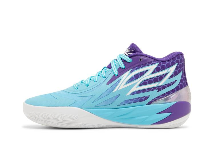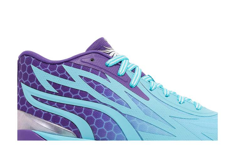 Модель PUMA MB.02 "Queen City" обновляет вторую фирменную обувь ЛаМело Болла, создавая двухцветную палитру, вдохновленную Шарлоттой, Северная Каролина. Фирменные тиловый и фиолетовый оттенки "Хорнетс" нанесены на сетчатый верх, укрепленный перьевыми синтетическими накладками, которые напоминают фирменные крылья ЛаМело. Личный логотип спортсмена украшает язычок и TPU-стойку пятки, которая переливается серебристым цветом. Промежуточная подошва из пеноматериала NITRO Infused от PUMA обеспечивает чуткую амортизацию при каждом шаге.