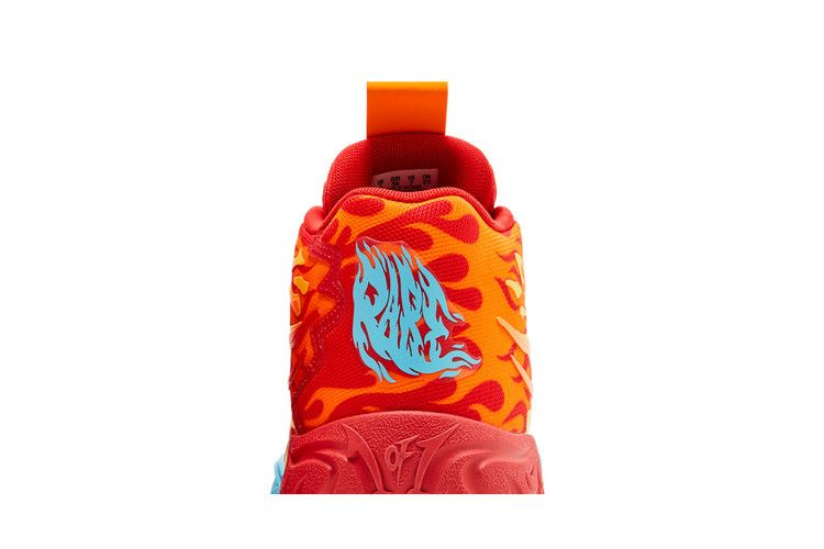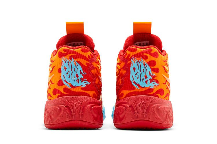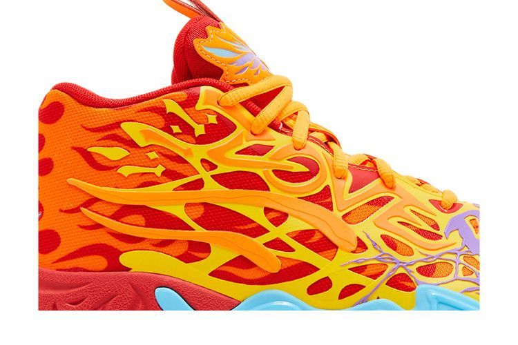 Модель PUMA MB.04 "Phoenix" украшена графикой красного пламени на оранжевом плетеном сетчатом верхе. Бесшовная конструкция покрыта запутанной паутиной синтетических накладок контрастных желтых и фиолетовых оттенков. На носочной части нанесена надпись "Rare", на боковой стороне - "1 of One", а на медиальной - "1 Love". Легкая амортизация обеспечивается малиновой промежуточной подошвой NITROFOAM, усиленной скульптурными защитными накладками из TPU яркого синего цвета. На резиновой подошве красуется надпись LaMelo Ball "Not From Here".