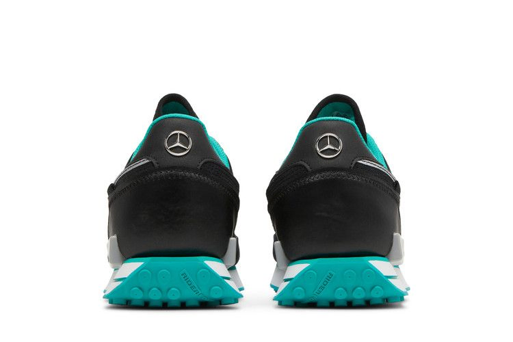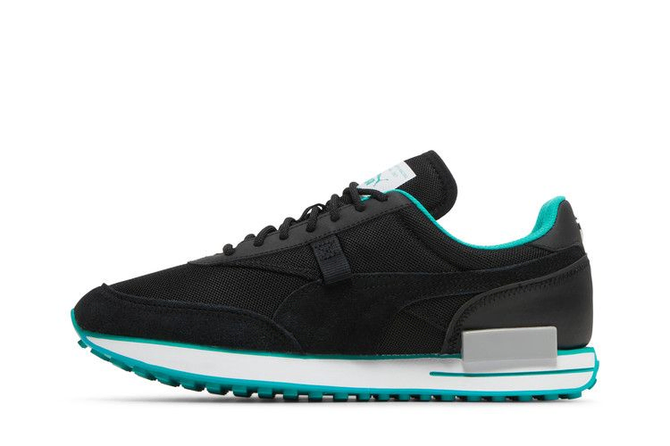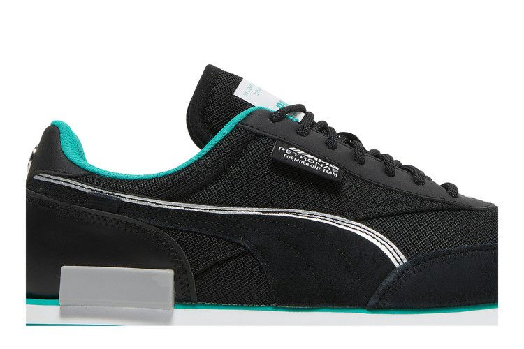 Модель Mercedes-AMG Petronas F1 x PUMA Future Rider 'Black', созданная в рамках более масштабной коллаборации, ориентированной на автоспорт, обновляет ретро-стиль с помощью простой двухцветной цветовой схемы и редких вспышек серебра. Они представлены в виде очерченной полосы Formstrip и хромированного значка Mercedes, прикрепленного к язычку на пятке. Верх из черной сетки и замши установлен на литую промежуточную подошву из ЭВА, усиленную подошвой PUMA Federbein бирюзового цвета.