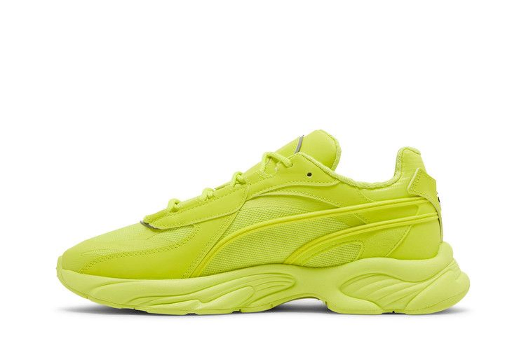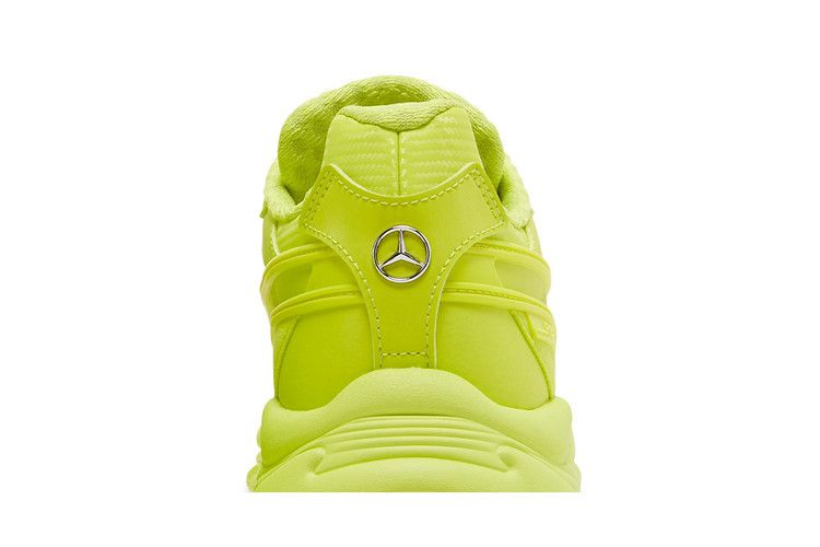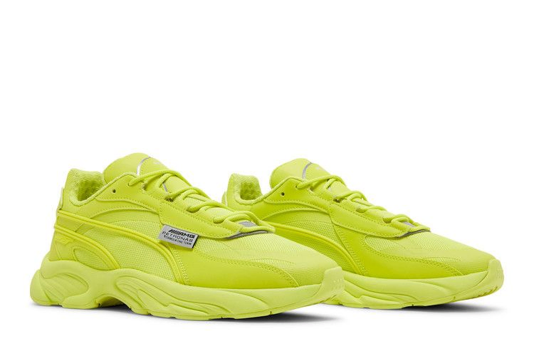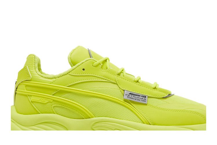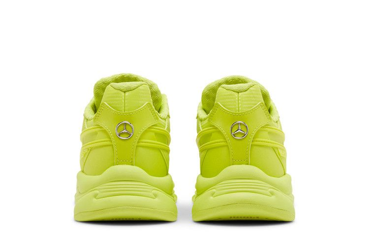 Модель Mercedes-AMG Petronas Motorsport x PUMA RS-Connect 'Bluemazing' окрашивает силуэт в неоново-зеленый оттенок. Бросающаяся в глаза монохромная отделка вместе с серебристыми светоотражающими акцентами отсылает к теме связи в мире, который становится все более цифровым. Верхняя часть состоит из дышащей сетки с накладками из искусственной кожи и полосой Formstrip из TPU. Хромированный значок Mercedes прикреплен к пятке, а на боковом наглазнике - тканая бирка с брендингом Mercedes-AMG Petronas. Подошва из пеноматериала, подобранного по цвету, дополнена технологией PUMA Retro Running System.