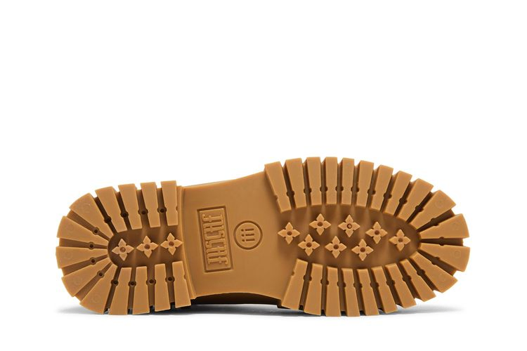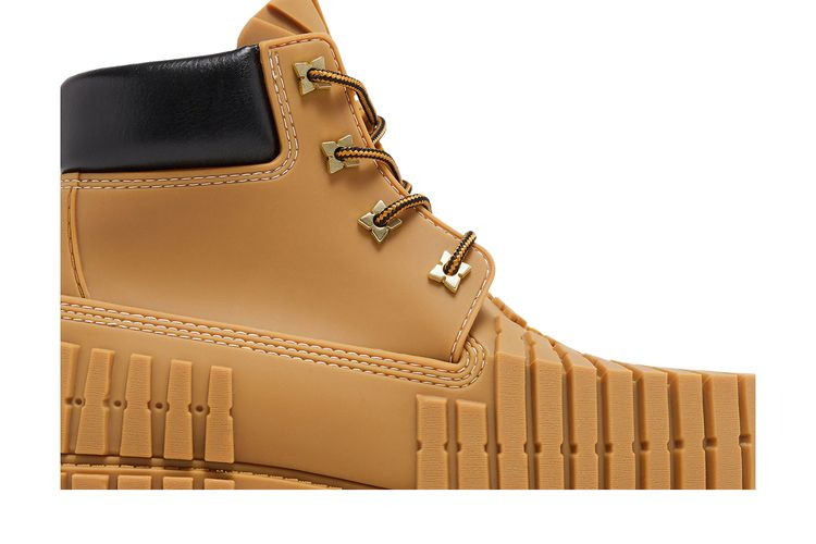 Модель MSCHF 2x4 'Camel' вдохновлена классическими рабочими ботинками. Прочный резиновый материал, из которого изготовлена подошва, переходит на всю верхнюю часть, а характерный рисунок на носках и язычке воссоздан. Двухцветные веревочные шнурки проходят через четырехконечные люверсы цвета золотистого металла, а искусственная черная кожа покрывает мягкий воротник с высокой посадкой. Тисненый брендинг MSCHF украшает нижнюю часть язычка и подошву.