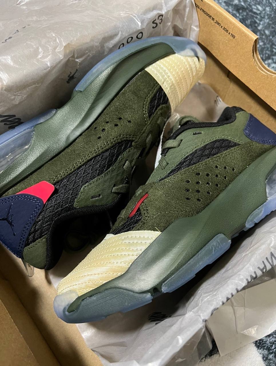 Модель Naruto x Jordan Air 200E 'Jonin' создана в рамках совместной коллекции, посвященной знаменитому аниме-сериалу. Силуэт выполнен из смешанных материалов: черная сетчатая основа, оливковая замша и текстиль кремового цвета на передней части стопы. В дополнение к вышитому Jumpman на медиальной стороне пятки, малиновый символ Uzushiogakure украшает язычок. Легкая амортизация достигается за счет оливково-зеленой мидсоли из вспененного материала, оснащенной блоком Max Air в пятке и поддерживаемой полупрозрачной резиновой подошвой.- Цвета: Carbon Green/Muslin/Metallic Silver/University Red