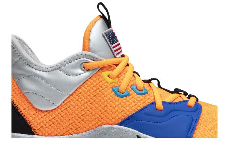 Специальная коробка NASA x Nike PG 3 "Armstrong Building 703", выпущенная в январе 2019 года, отражает детскую страсть Пола Джорджа к освоению космоса. Трикотажные бутсы Total Orange напоминают летные костюмы астронавтов со стеганым металлическим воротником. Метка в виде американского флага, официальные значки и текстовая детализация на пятке воплощают дух научных открытий. Легкая межподошва из пеноматериала поддерживает переднюю часть стопы Zoom Bag, а круглый протектор подошвы вдохновлен лунными кратерами. Коробка специального издания напоминает поверхность Луны с отпечатком протектора PG3.