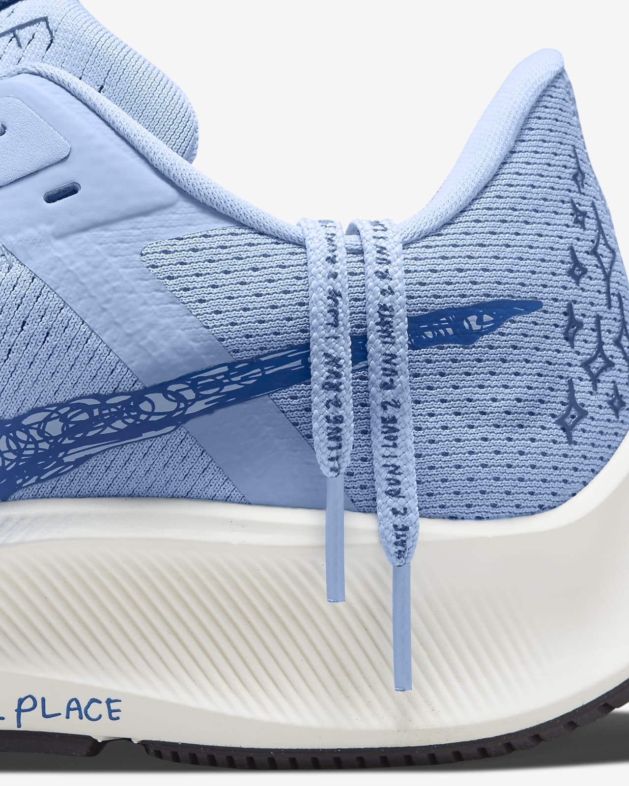 Модель Nathan Bell x Nike Air Zoom Pegasus 38 A.I.R. "Run to a Magical Place" представляет собой интерпретацию беговых кроссовок в исполнении художника из Лос-Анджелеса. Верх из дышащей сетки отделан алюминием и украшен графикой, нарисованной от руки на четверти и пятке. Написанный от руки текст на шнурках призван отразить внутренний монолог спортсмена. Легкая конструкция установлена на полноразмерную промежуточную подошву Nike React, оснащенную блоком Zoom Air в передней части стопы для повышения отзывчивости.- Цвета: Aluminum/Sail/Black/Game Royal