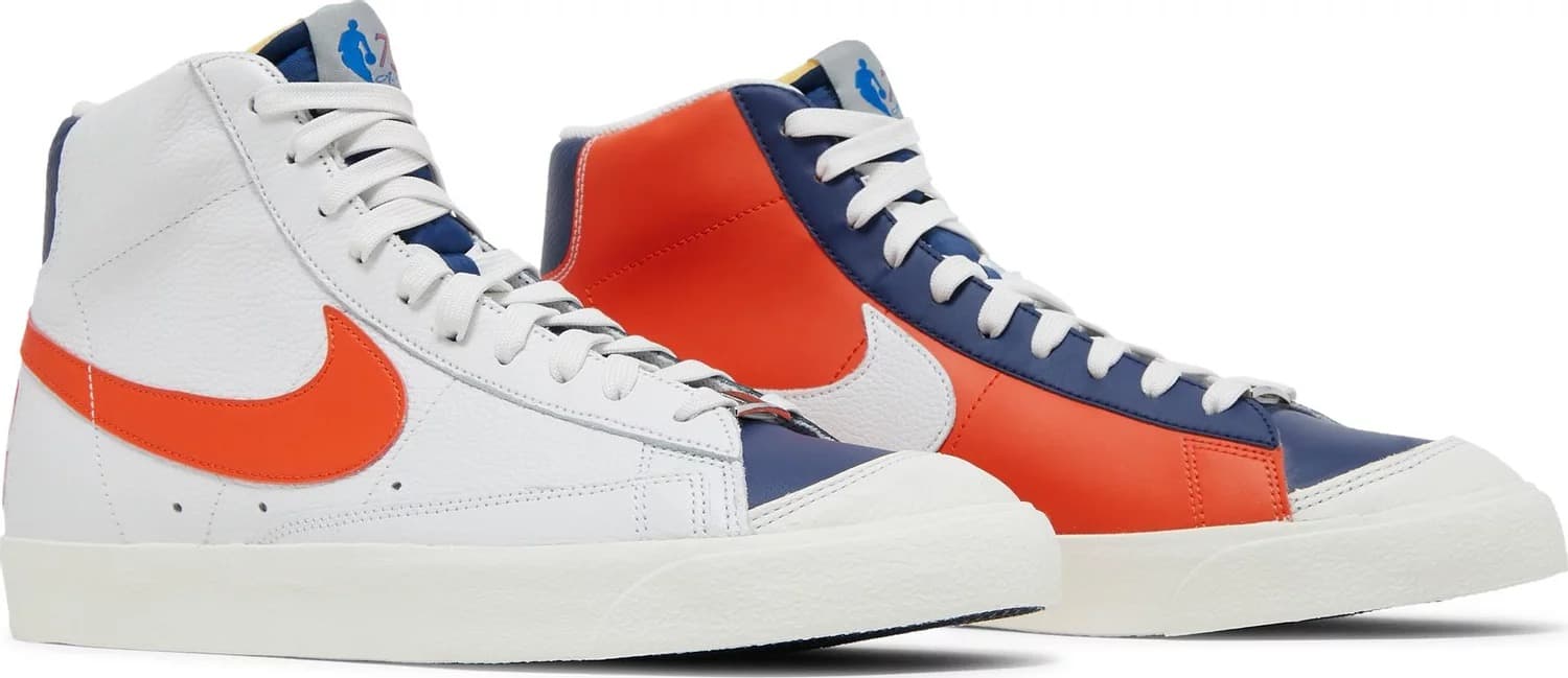 Модель NBA x Nike Blazer Mid '77 EMB "Knicks", созданная в рамках коллекции, посвященной 75-летию лиги, демонстрирует цветовую схему, вдохновленную знаменитой нью-йоркской франшизой. Кожаный верх винтажных кроссовок выполнен в асимметричной цветовой гамме: латеральная сторона имеет белую основу и оранжевый ретро Swoosh, а медиальная сторона сочетает оранжевую основу с белым Swoosh и накладкой для глаз Blue Void. Последний оттенок повторяется на мыске, пятке и язычке из пеноматериала, последний украшен тканой меткой 75-летия. Вышитая графика на боковой пятке отображает культовый логотип NBA.