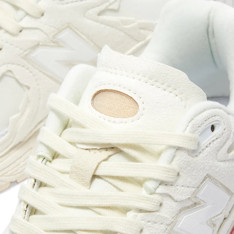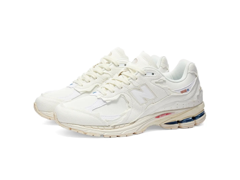 Модель New Balance 2002R Protection Pack Sea Salt из белой кожи с накладками из потертой замши в области передней части стопы и пятки. Детали включают логотип «N» в тон, язычок из пенопласта и логотип 2002R красного и синего цветов. Кроссовки оснащены мидсолью ABZORB, поддерживаемой под ногами прочной подошвой N-ergy.- Цвета: Sea Salt/Munsell White