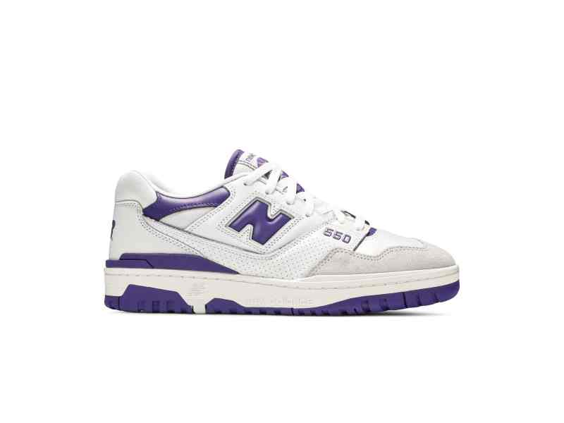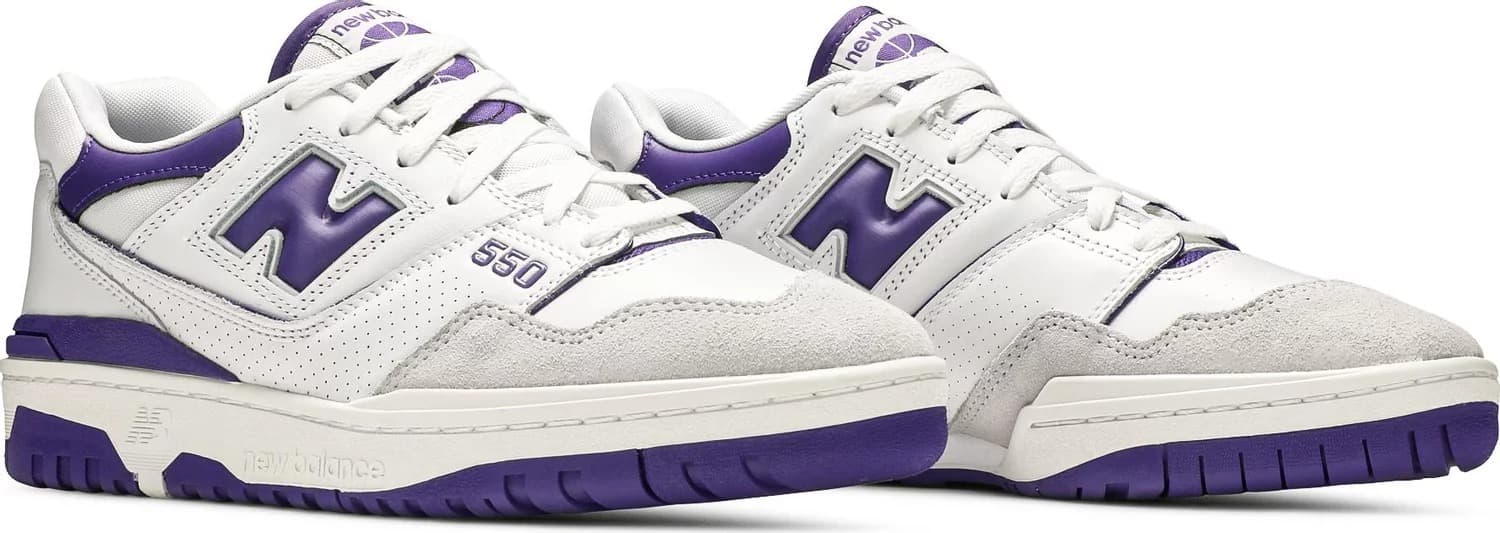 Модель New Balance 550 "White Purple" представляет собой упрощенный двухцветный вариант ретро-кроссовок, выпущенных в 1989 году. Верхняя часть состоит из белой кожи с тональной замшевой накладкой в носочной части и контрастными фиолетовыми акцентами по всей поверхности. Они включают в себя зажим для пятки из TPU, рельефный логотип "N" на задней панели и надпись "550" на боковой стороне передней части стопы. Низкий верх опирается на прочную резиновую подошву с открытым клином EVA на медиальной боковине.