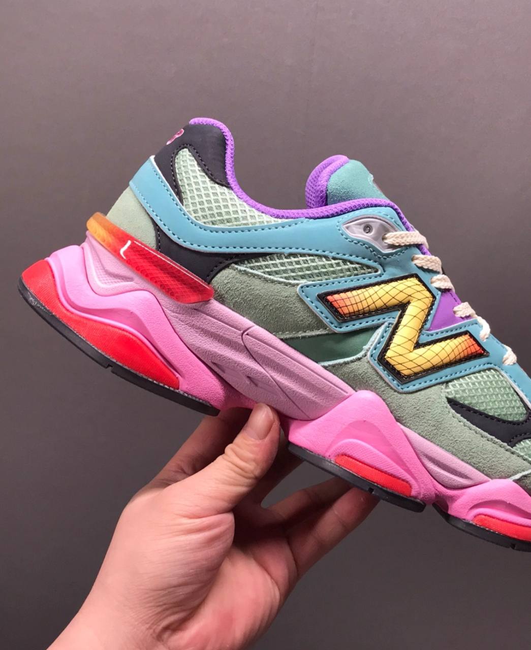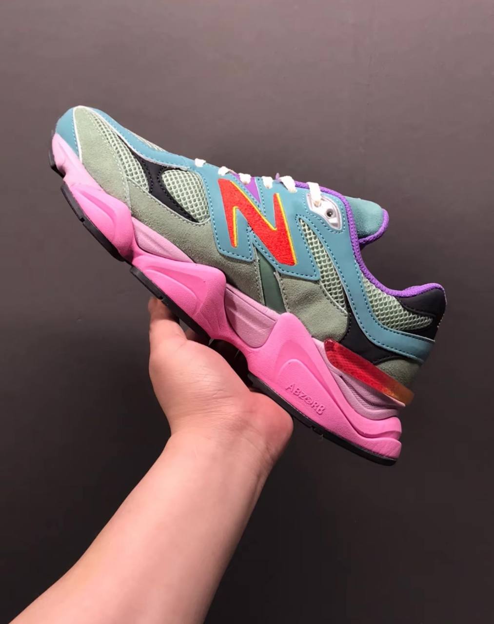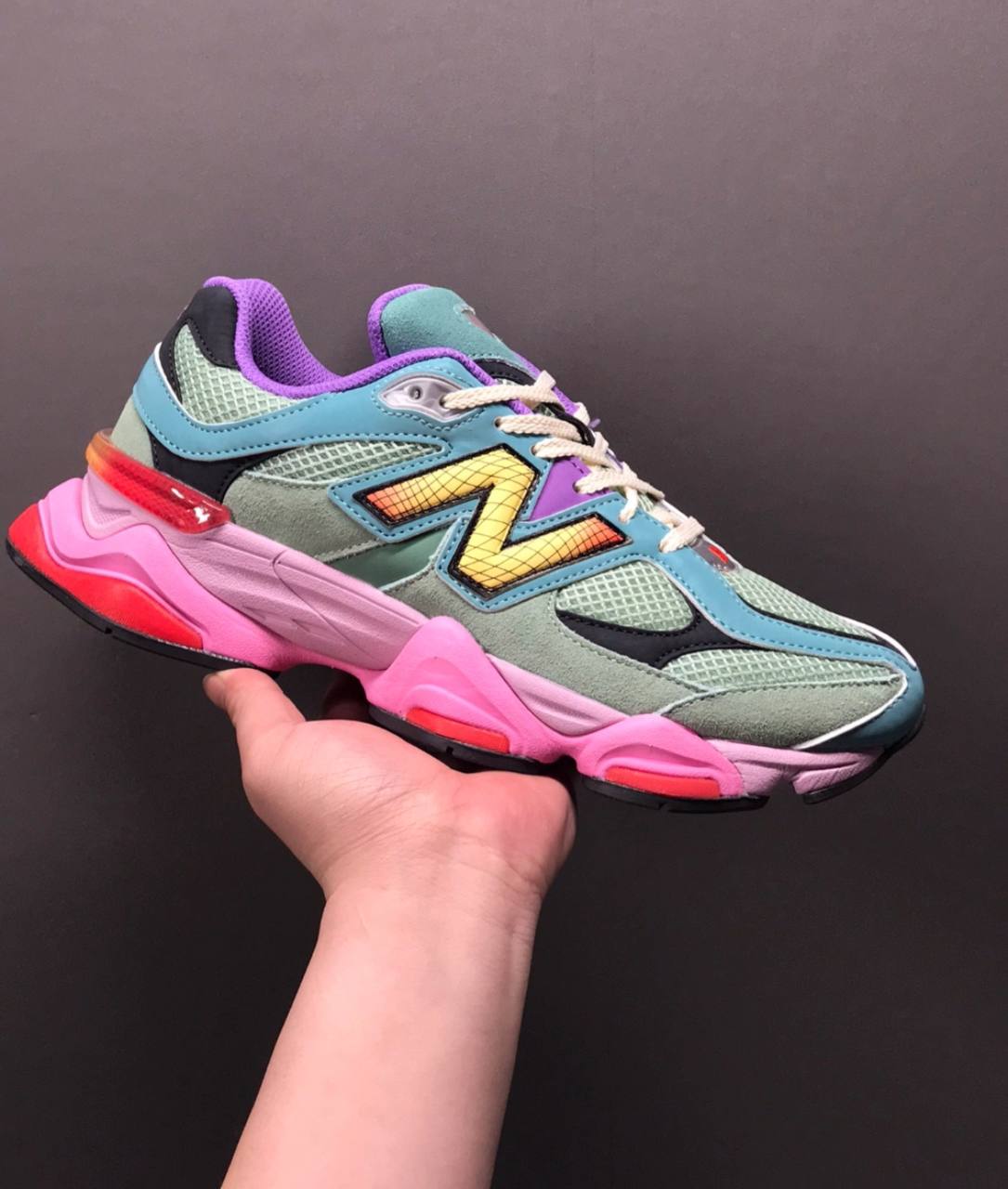 New Balance 9060 представлены в весенне-летней цветовой гамме, которая включает в себя яркие и смелые цвета, покрывающие всю верхнюю часть. Обувь выполнена из смеси сетки, кожи и замши с градиентным рисунком в виде заката на боковом логотипе "N", а на среднем - красная и желтая вышивка. Розовая двухцветная промежуточная подошва на черной резиновой подметке завершает дизайн.- Цвета: Teal