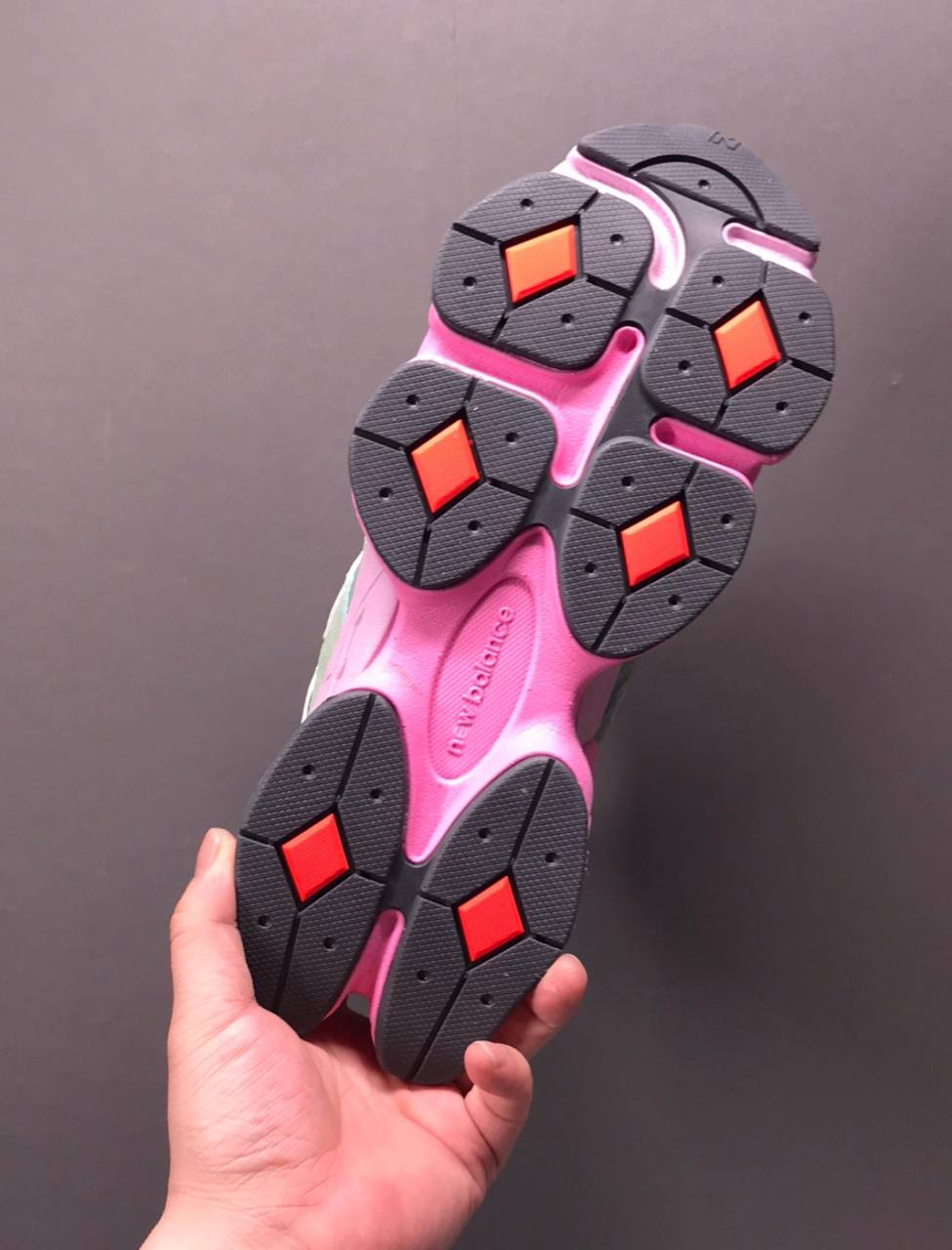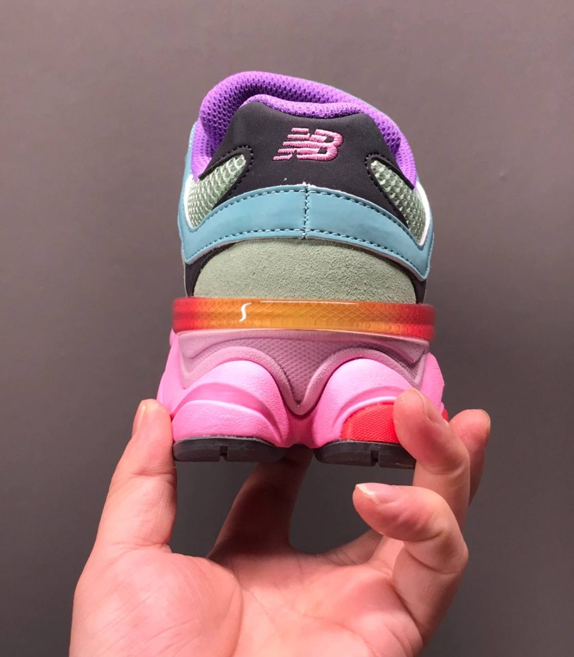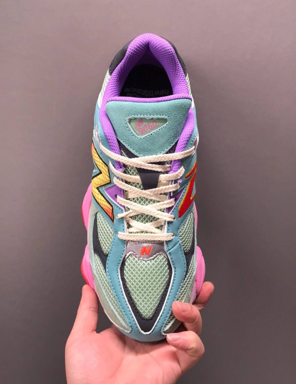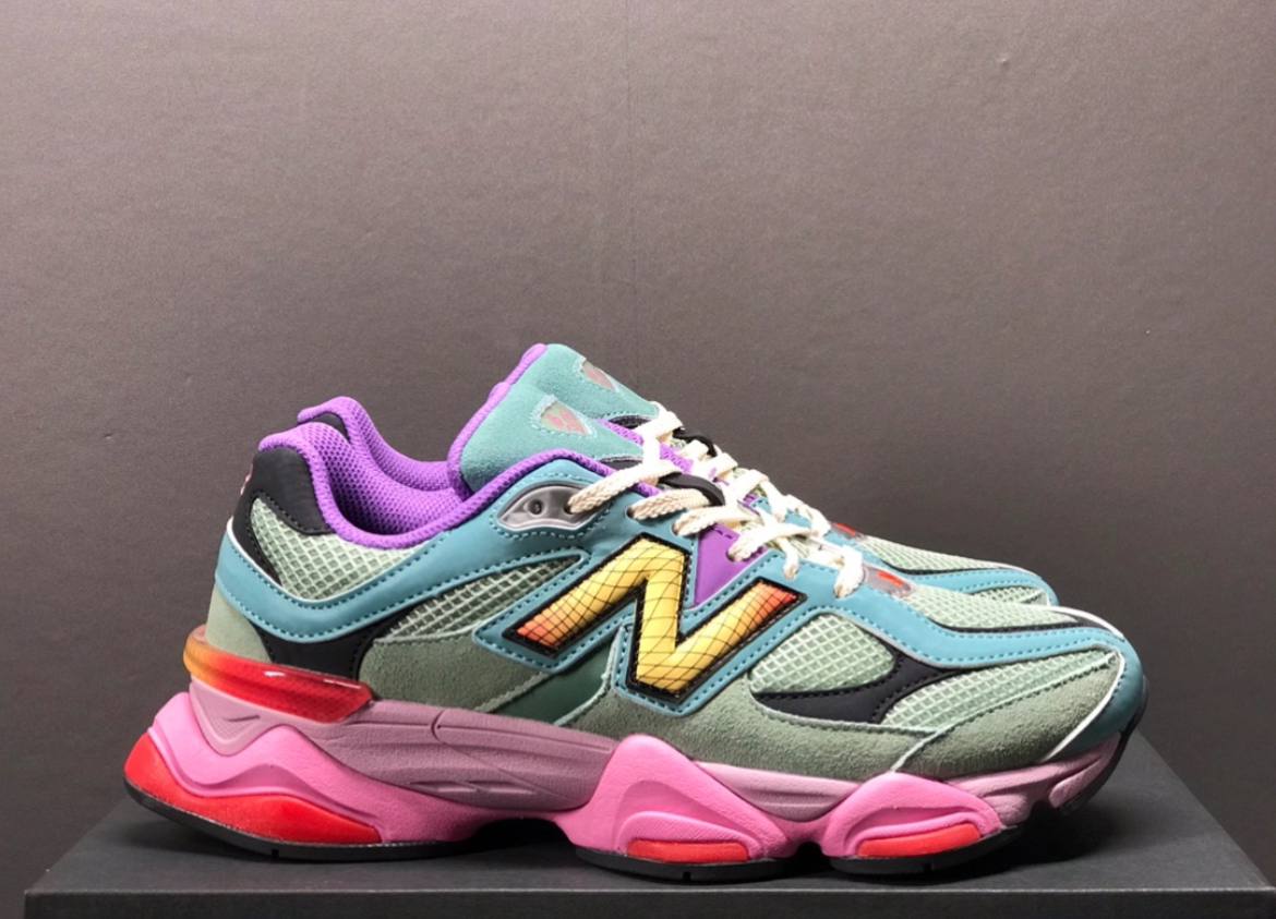 New Balance 9060 представлены в весенне-летней цветовой гамме, которая включает в себя яркие и смелые цвета, покрывающие всю верхнюю часть. Обувь выполнена из смеси сетки, кожи и замши с градиентным рисунком в виде заката на боковом логотипе "N", а на среднем - красная и желтая вышивка. Розовая двухцветная промежуточная подошва на черной резиновой подметке завершает дизайн.- Цвета: Teal