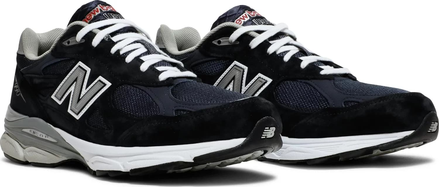 Модель New Balance 990v3 Made in USA 'Navy' использует традиционную конструкцию, сочетающую сетку цвета полуночного темно-синего моря с накладками из черной свиной замши. Светоотражающие серые акценты украшают логотип 'N' и перфорированный язычок на пятке из искусственной кожи, отмеченный брендингом "Made in USA". На язычке красным шрифтом вытиснена надпись "New Balance", которая является единственным контрастным цветовым пятном на кроссовке. Кроссовки установлены на промежуточную подошву ENCAP от New Balance, которая содержит мягкую пенную основу в прочном полиуретановом ободе.- Цвета: Navy/Black