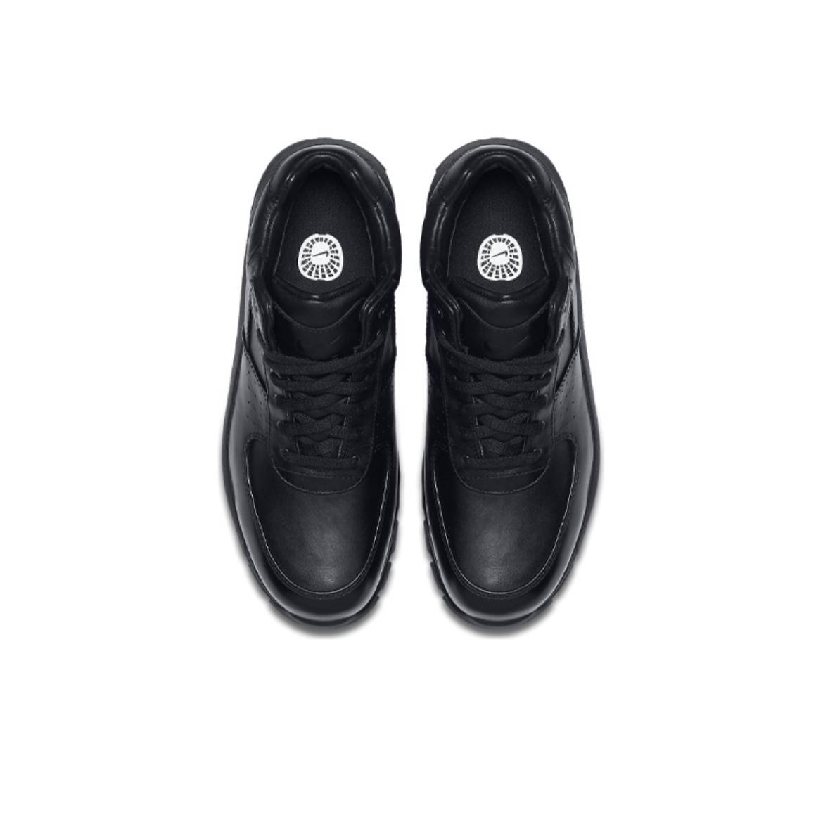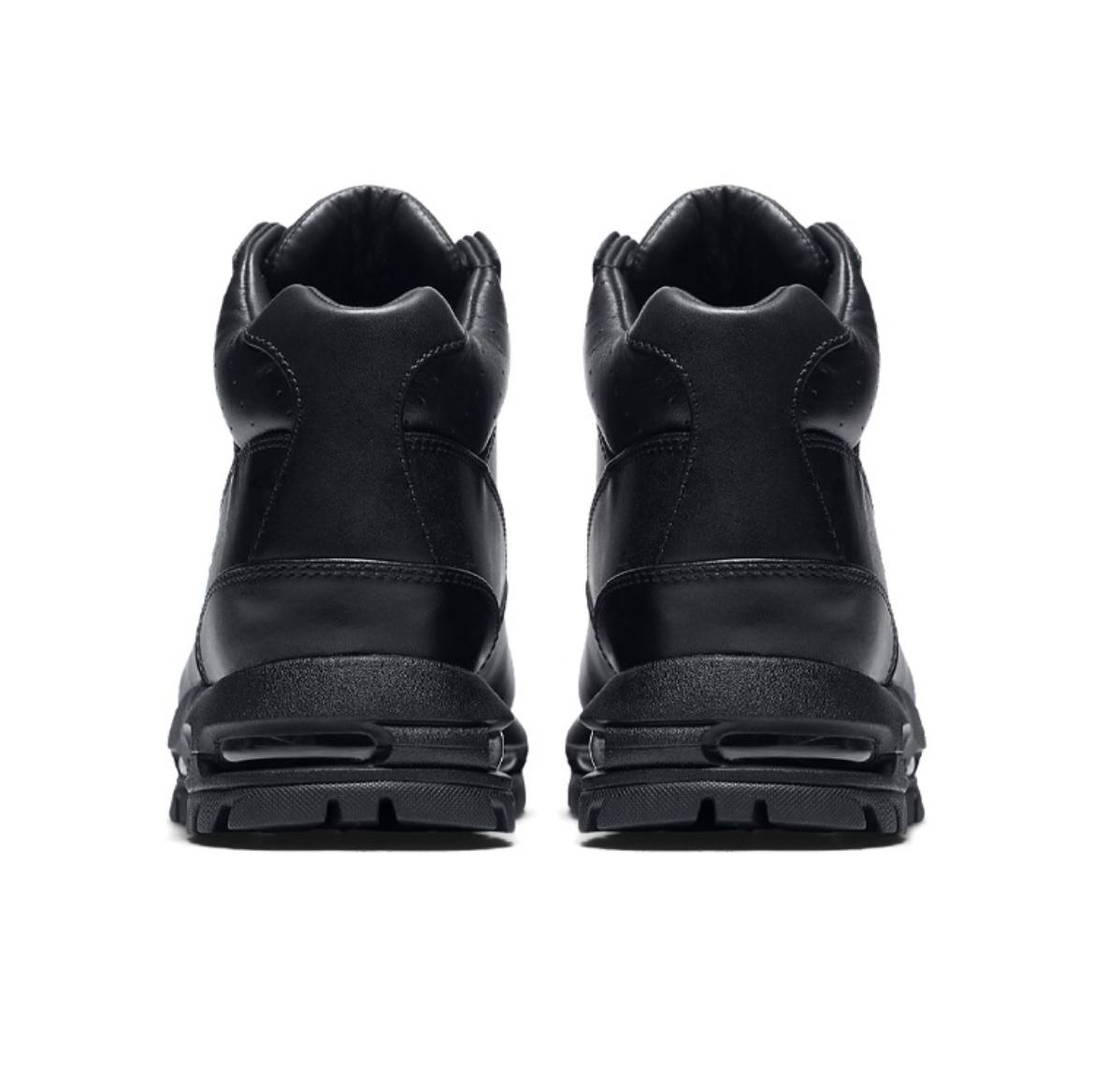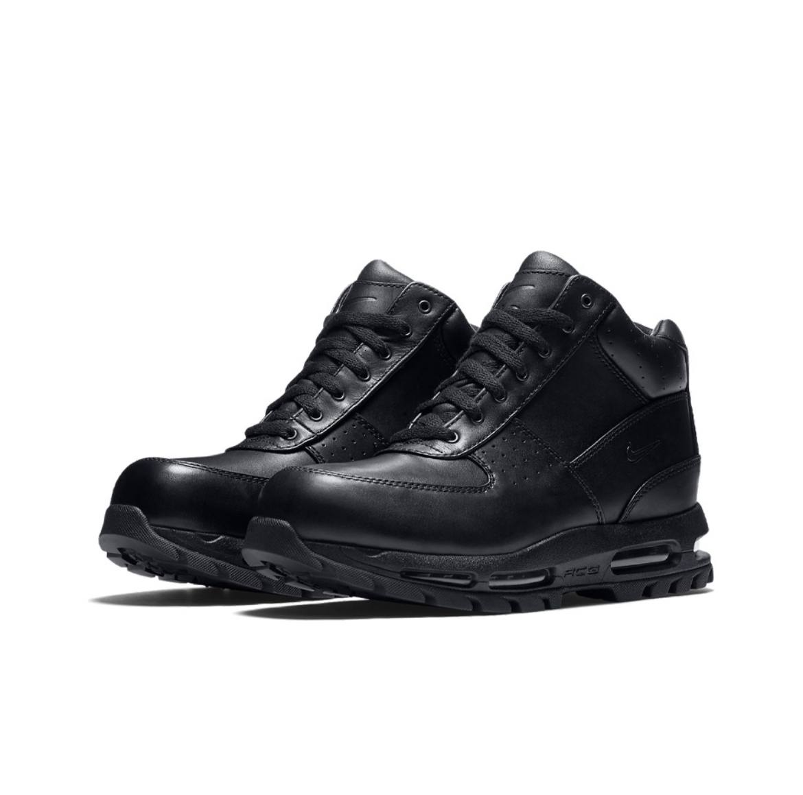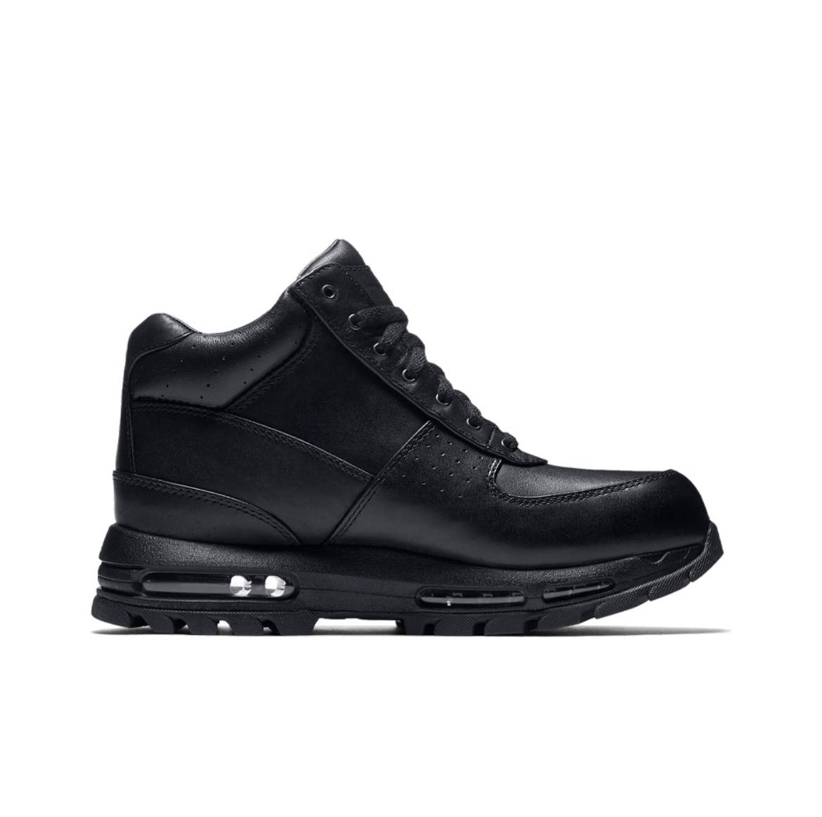 Ботинки Nike Air Max Goadome имеют конструкцию All Conditions Gear, верх из водонепроницаемой зернистой черной кожи с ластовицей. Перфорация обеспечивает вентиляцию, а на носке имеется защитный бампер. Ботинки Triple Black среднего кроя также оснащены видимым полноразмерным блоком Max Air и резиновой подошвой All-Trac с прочным рисунком.- Цвета: Black/Black-Black