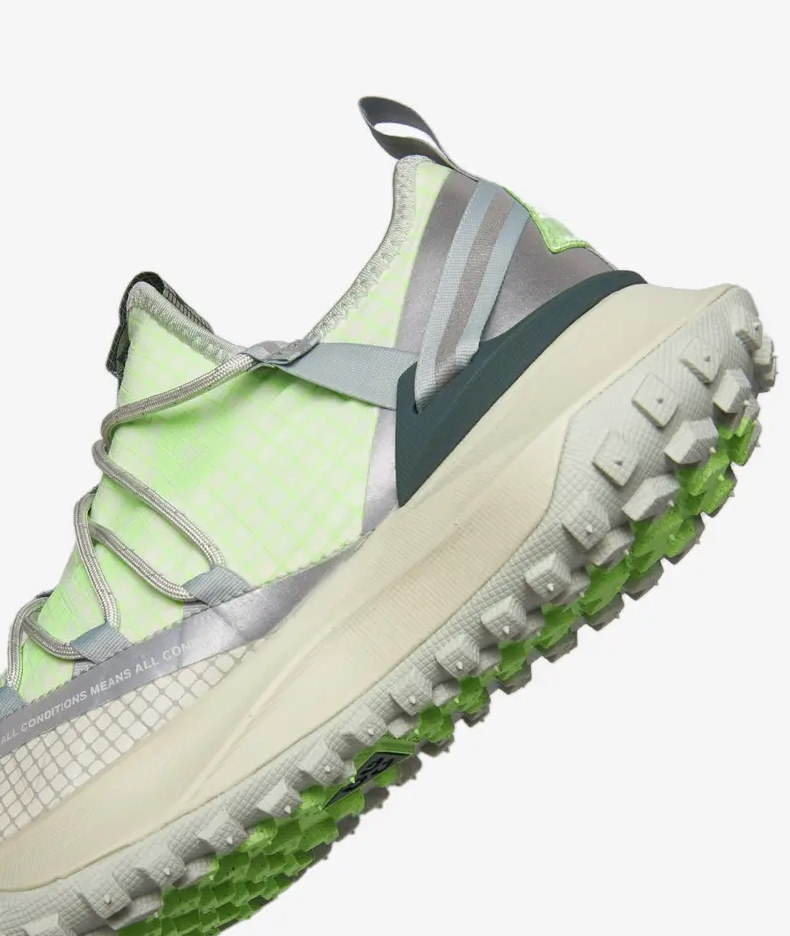 Nike ACG Mountain Fly Low «Sea Glass» имеет силуэт с прочной резиновой подошвой с выступами, которая охватывает переднюю часть стопы, обеспечивая надежное сцепление во всех направлениях и в любых условиях. Не совсем белая межподошва содержит пену Nike React. Сверху шнурки с веревками оборачиваются поверх текстильного верха, обеспечивая особо надежную посадку при затяжке шнурков. Светоотражающие детали нанесены на накладные части кроссовок, что обеспечивает дополнительную видимость в условиях низкой освещенности.- Цвета: Sea Glass/Lime Blas