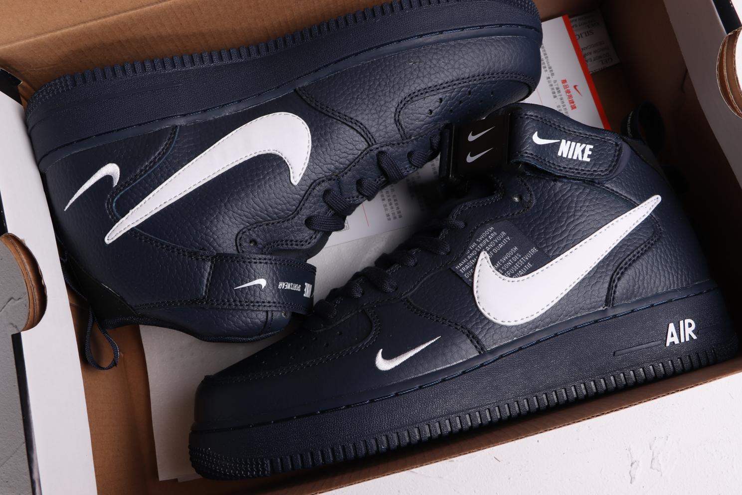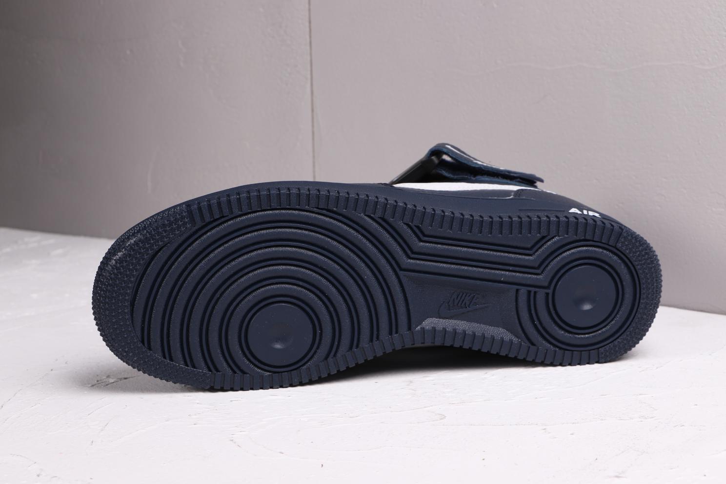 Модель Nike Air Force 1 Mid Utility Obsidian выпущена в декабре 2018 года и имеет белый логотип-акцент на своем темно-синем верхе. Кроссовки оснащены кожаным верхом премиум-класса с увеличенным Swoosh и биркой с текстом на средней части стопы. Функциональный ремешок на щиколотке включает несколько миниатюрных белых Swooshes подчеркивая дизайн с фирменной отделкой, а тональная мидсоль с белым логотипом Air и резиновая подошва завершают образ.