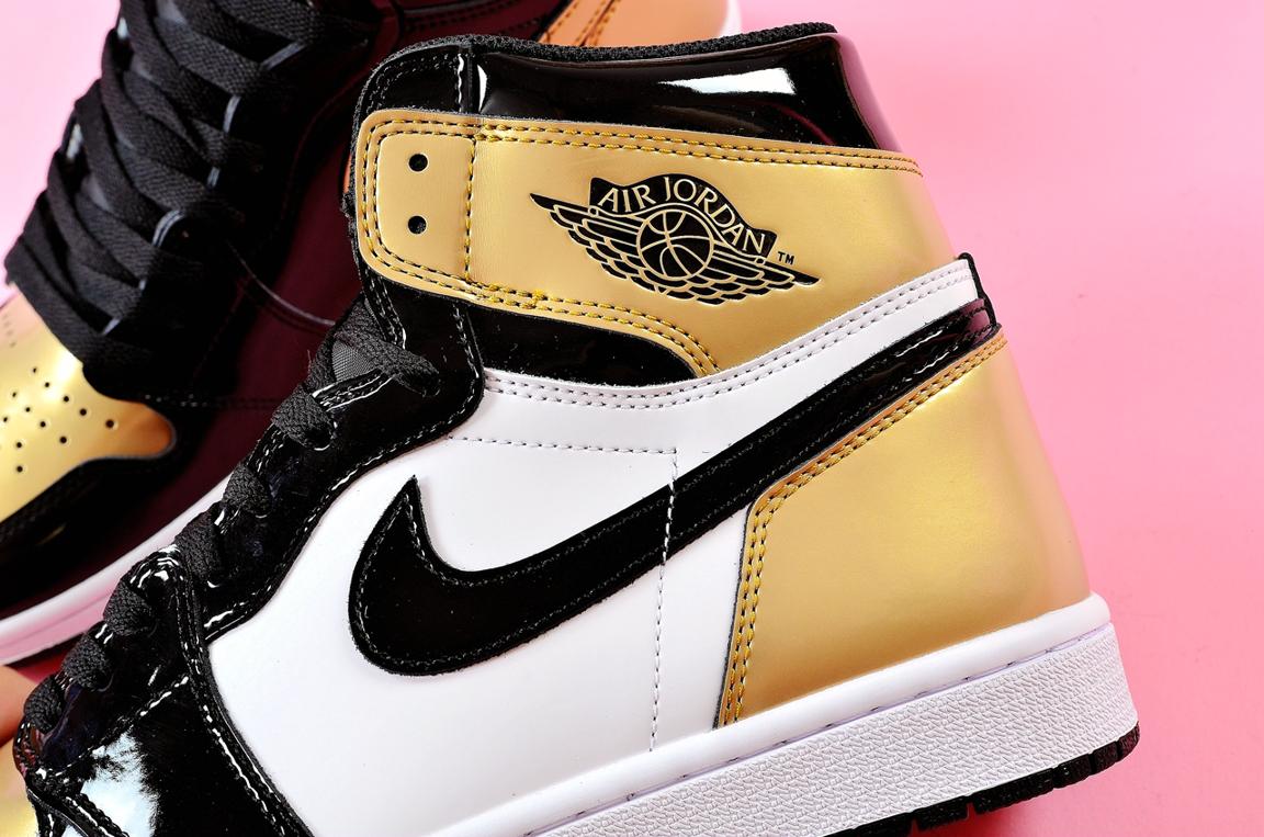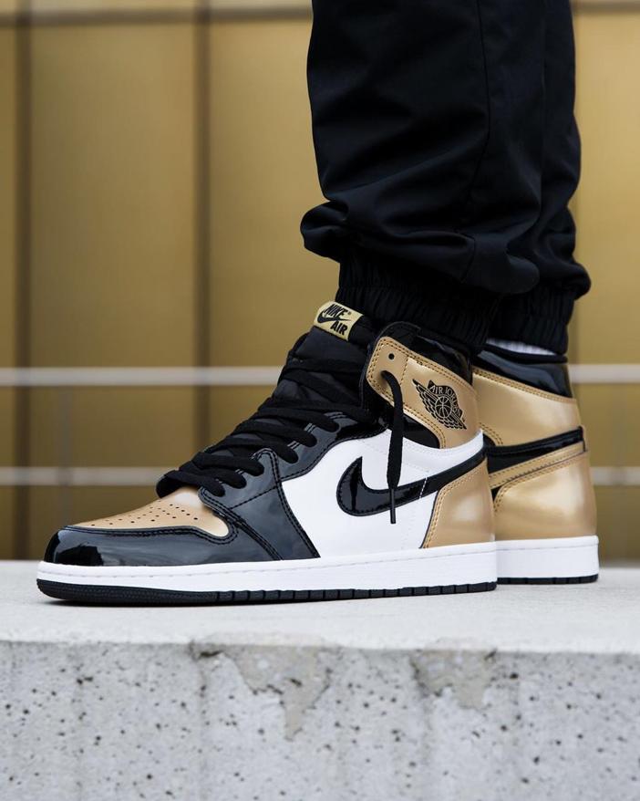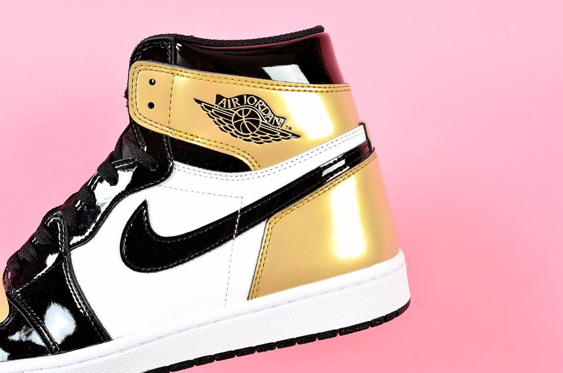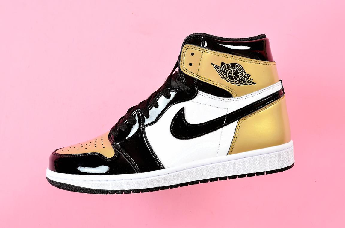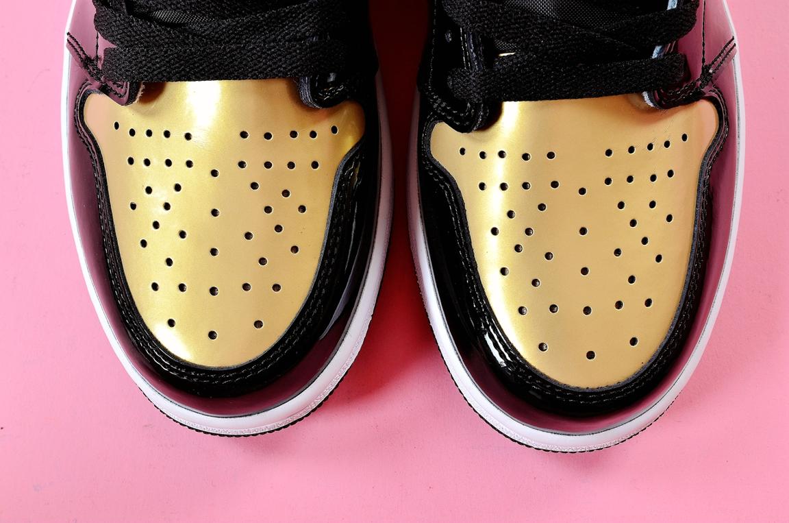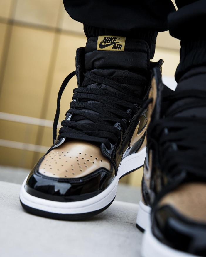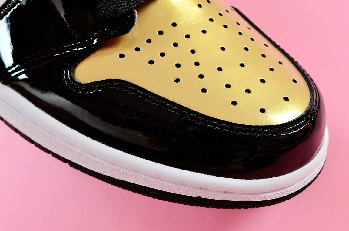 Модель Nike Air Jordan 1 Retro High OG NRG Gold Toe выпущена 16 февраля 2018 года. Кроссовки с золотым мыском оснащены черным лакированным верхом из кожи с металлическими акцентами на перфорированной отделке, фирменным язычком и пяточной панелью. Модель также имеет белую боковую часть, которая простирается от средней части стопы до пятки. Другие детали включают в себя замшевые акценты на структуре шнуровки, большой фирменный логотип Swoosh и белую мидсоль с черной подошвой.- Цвета: Black/Black-Metallic Gold-White