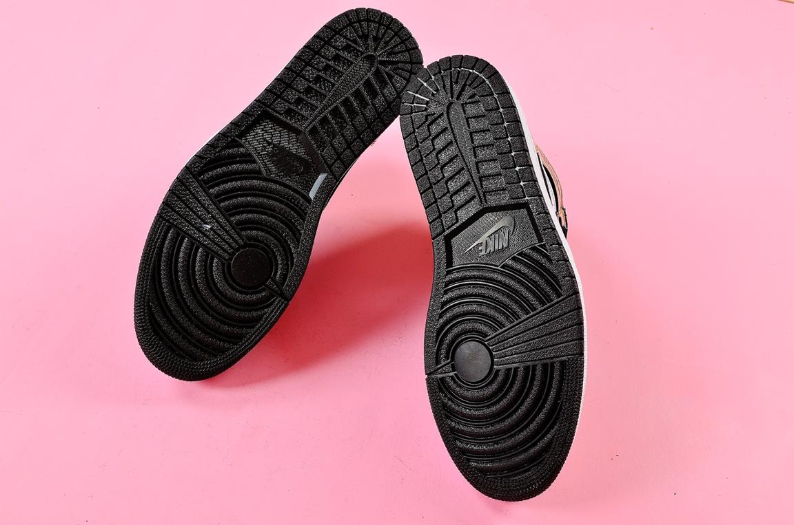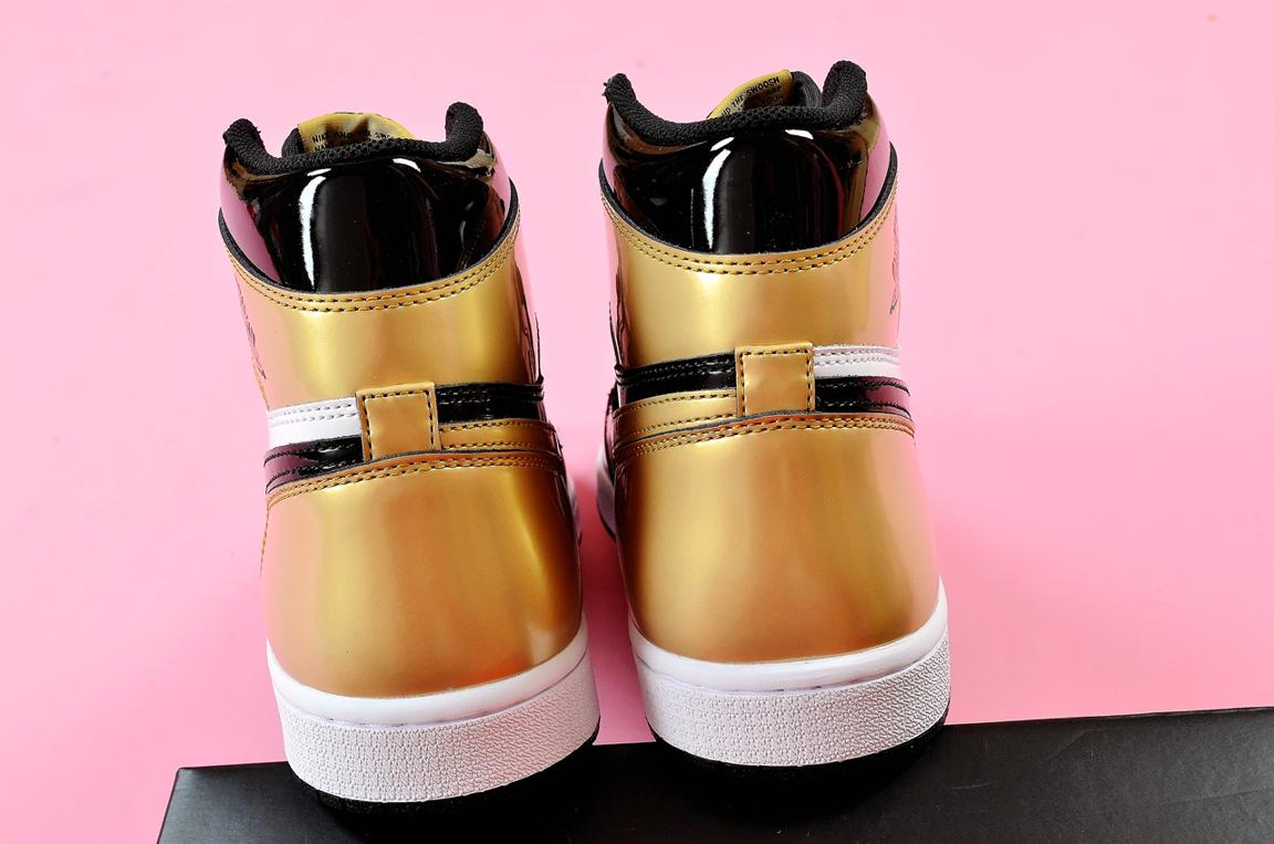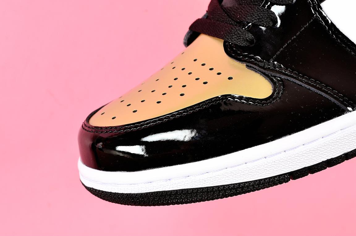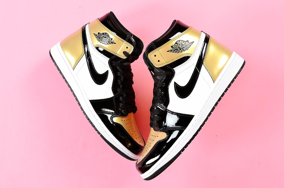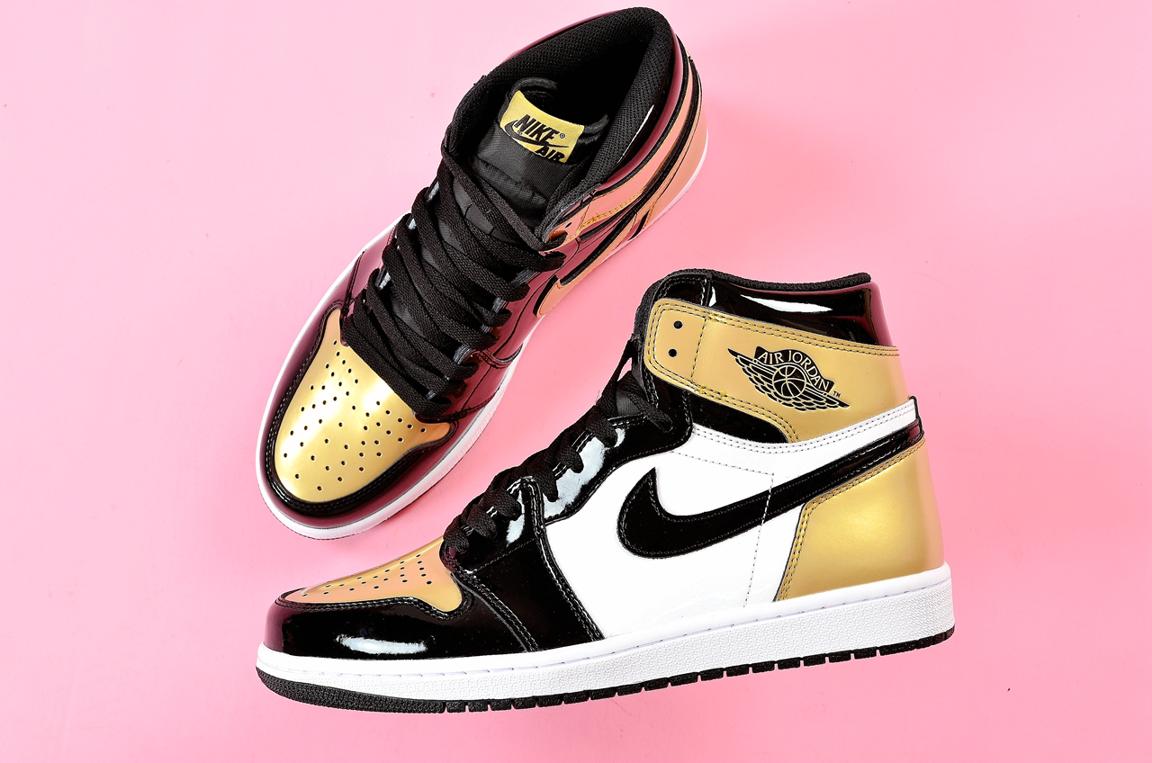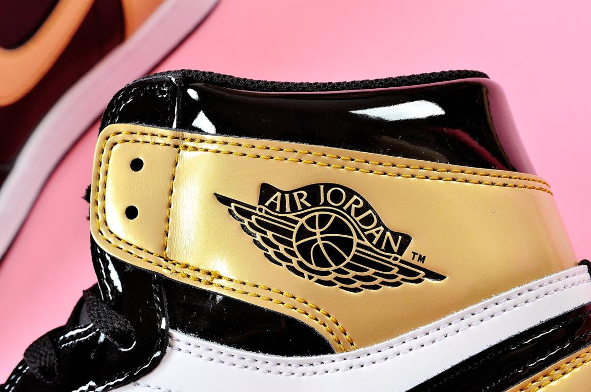 Модель Nike Air Jordan 1 Retro High OG NRG Gold Toe выпущена 16 февраля 2018 года. Кроссовки с золотым мыском оснащены черным лакированным верхом из кожи с металлическими акцентами на перфорированной отделке, фирменным язычком и пяточной панелью. Модель также имеет белую боковую часть, которая простирается от средней части стопы до пятки. Другие детали включают в себя замшевые акценты на структуре шнуровки, большой фирменный логотип Swoosh и белую мидсоль с черной подошвой.- Цвета: Black/Black-Metallic Gold-White